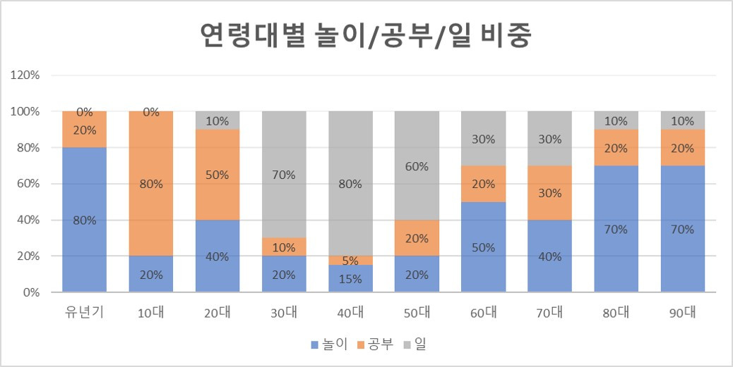 삶에서 일, 공부, 놀이의 비중이 어떻게 변하는지 간단히 시뮬레이션했다. 50대 초인 내 나이를 기준으로 과거는 경험치와 상식을 반영했다. 미래는 희망사항이다. 생활이 무너지지 않을 만큼의 현금흐름을 전제로 한다(돈 얘기는 여기선 생략).