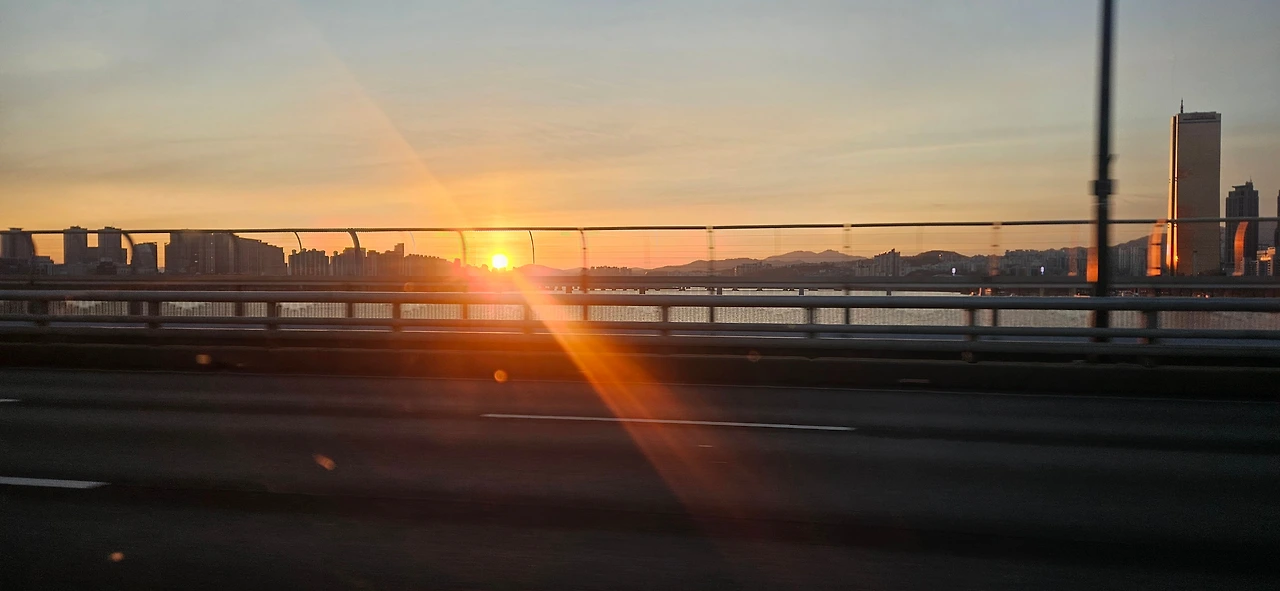 택시 타고 서울역 가는 길에 마포대교 위에서 일출을 봤다.