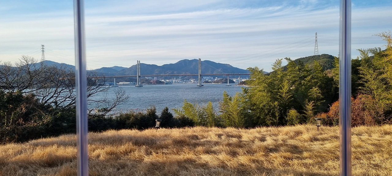 멀리 마창대교가 보인다. 아버지는 오랜만의 외출이다. 오토바이가 고장 나서 수리를 맡겼다 하신다. 지근거리 용도다. 카페 창밖으로 바다와 바로 눈앞 색 바랜 잔디가 대비를 이룬다.