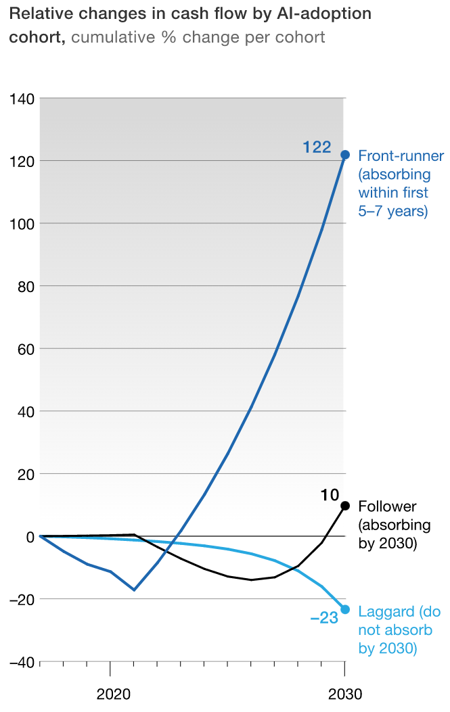 2020년 5월에 텔레마케팅 디지털 전략을 짜며 땀이 삐질삐질 났다. 코로나로 세상이 일순간 정지했던 그때다. 1년여 공들여 만든 AI비서를 일부 영업점에서만 시험적으로 사용하고 있었다. 출장 금지로 지방 영업점에 확산할 수 없었다. 놀 수는 없으니 탁상에서 공론이라도 열심히 해야 했다. 왜 AI에 계속 돈을 써야 하는지 논거를 대려고 맥킨지(글로벌 컨설팅 회사)가 2018년 9월 시점에 시뮬레이션한 그래프(그래프 #1 참조)를 인용했다. 3년 후에는 특이점이 옵니다 강변했다. 텔레마케팅 사업 고문께서 지지해 준 덕에 미팅을 잘 마쳤지만......속으로는 반신반의했다.