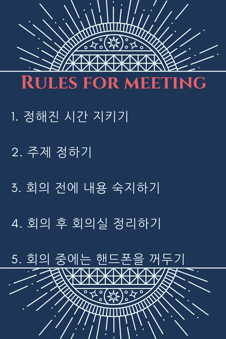 그리고 또 하나 사무실에서 보내는 비효율적인 시간 중에 하나가 바로 회의 시간이었다. 회의는 혼자 하는 것이 아니다 보니, 뚜렷한 주제를 가지고 더 효율적으로 진행해야 함에도 불구하고, 오랜만에 만나 동료들이 반갑다 보니, 사적인이야기를 더 많이 하고는 했다. 이러한 회의 시간에 누군가의 연애이야기, 가족이야기를 본 주제보다 더 많이 들은 적도 많았다. 대부분 회의를 할 때는 시간을 정해놓고, 도출해야 하는 결과를 목적으로 진행을 해야 하는데, 1시간 회의에 40분을 수다를 떨고 20분 동안만 주제에 대해 이야기하고 결론을 도출하는 경우도 있다. 또는 1시간을 넘어서도 수다만 떨다가 정작 해야 할 이야기는 꺼내지도 못하고 다음으로 미루던가 회의 시간이 터무니없이 길어지는 경우도 있다. 회사에서도 이렇게 시간이 낭비되는 것을 알고 있기에 회의실에 효율적으로 회의하는 법이라는 포스터를 걸어 두기도 했었다.