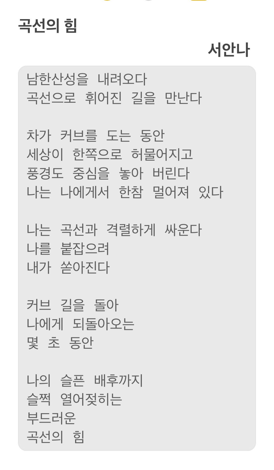 곡선과 격렬히 싸우며 나를 붙잡으려다가 내가 쏟아진다는 구절은 등골이 오싹할 만큼 섬뜩했다. 난 내 인생의 커브와 격렬히 싸우다가 내 정체성 자체가 통째로 흔들리는 경험을 하고 있다. 그런데 작가는 마지막 구절에서 나의 슬픈 배후까지 슬쩍 열어젖히는 곡선을 부드러운 힘으로 묘사하고 있다. 이는 인생의 굴곡이 사람을 흔들어 놓지만 종국에는 그를 성숙시킨다는 긍정의 결론이라 할 수 있다. 그리고 남한산성의 커브 길처럼 곡선을 돌아 나오는 시간은 길어봐야 몇 초 동안이라는 것이다.