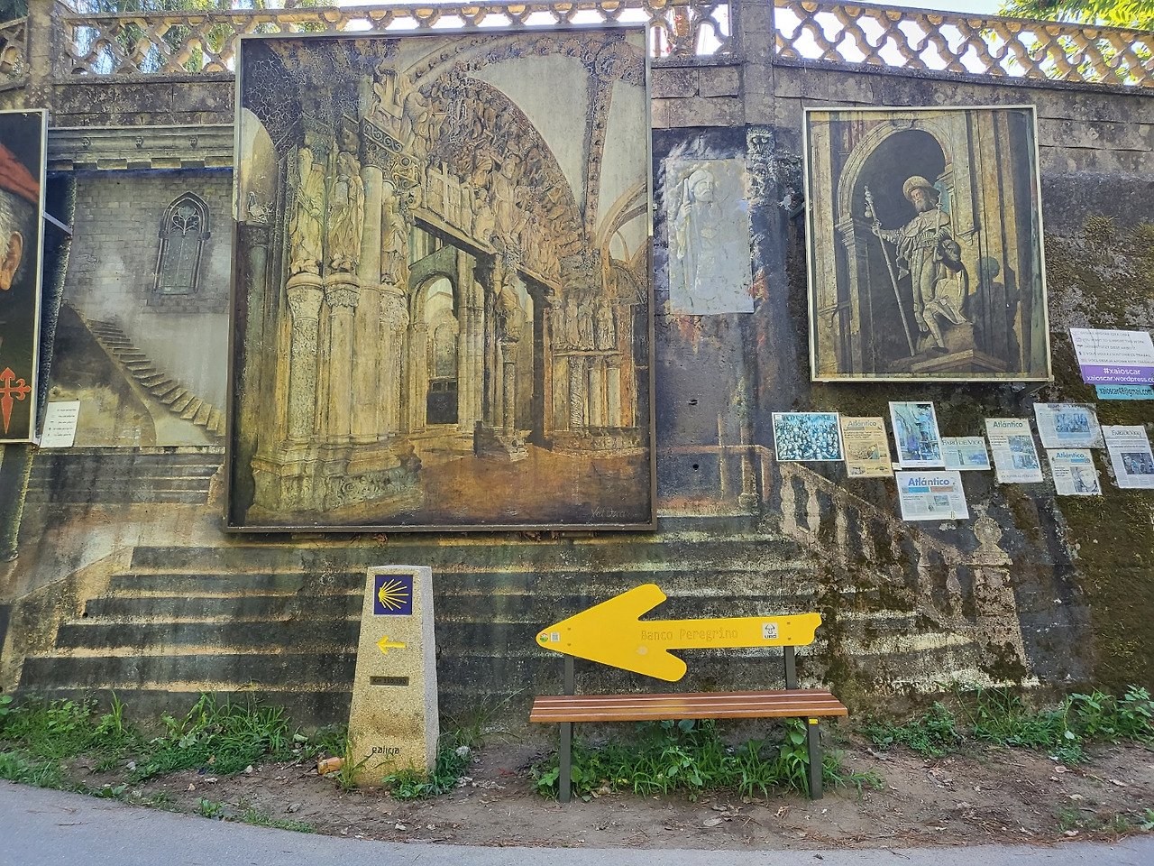 출발해서 걷다 보니 숲길과 산길이 적당히 어우러져 있는 예쁜 길이 이어졌다. 낮은 산길을 헉헉 거리며 올라가다 보니 멋지게 벽을 꾸며놓은 곳이 있었는데, 그 앞에 산티아고까지의 거리가 쓰여있는 표지석과 노란 벤치가 눈에 확 띄었다. 다리도 아픈데 잠깐 쉬었다 가기로 하고 가방을 벤치에 내려놓았다.