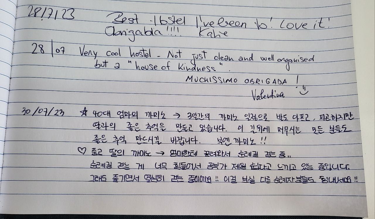 체크인이 끝나고 고개를 돌려보니 데스크 옆에 방명록이 있었다. 우리는 한글을 찾아 방명록을 넘겼고, 한국분들이 써놓은 몇 개의 글을 읽으며 가슴 따뜻한 응원의 메시지를 볼 수 있었다.