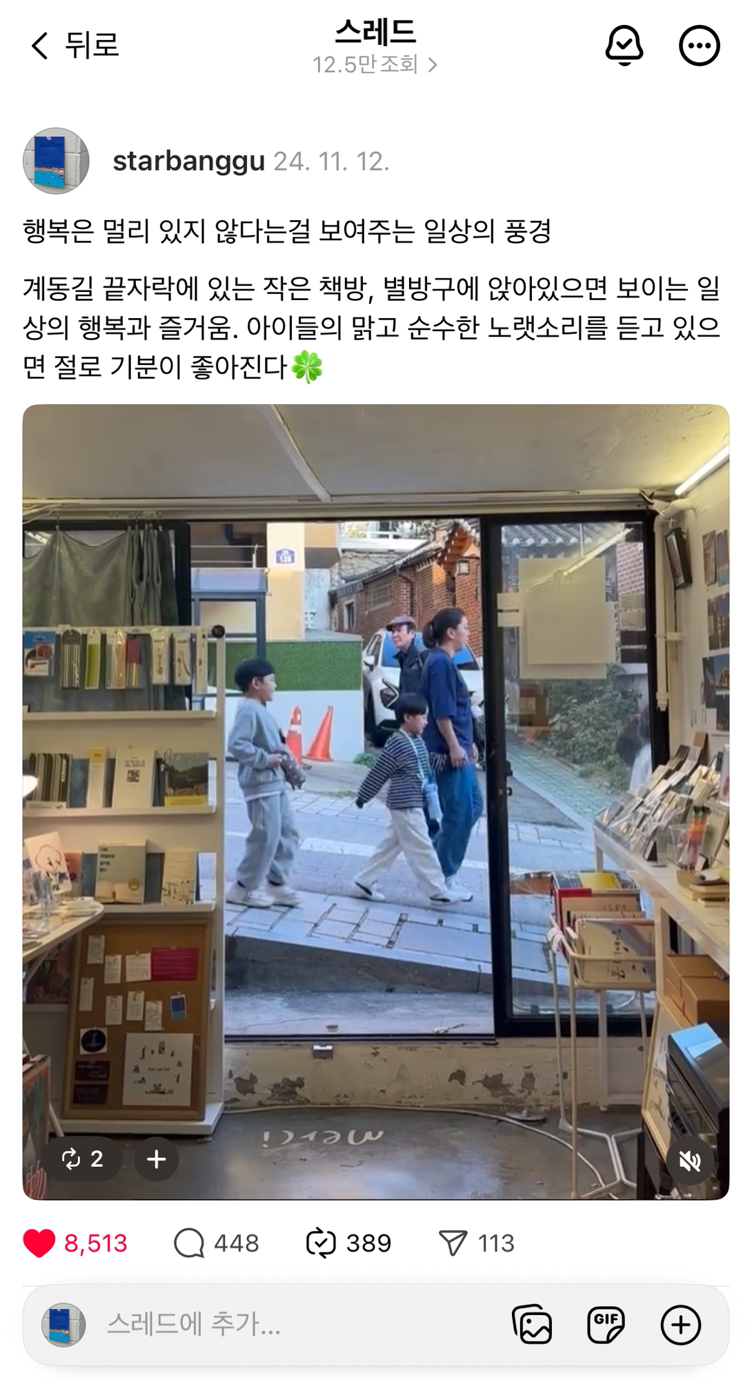 이년이라는 시간 동안 서점을 오가며 아이들의 그런 모습을 본 것은 정말 그날이 처음이었다. 그래서 그날 이후 이 동네 근처의 어린이집을 다니는 아이들인가? 하고 주변을 계속 살피게 되었는데, 아이들의 행복의 원천은 선생님께서 달아주신 댓글을 통해 알게 되었다. 선생님께서는 곧 있을 어린이집 졸업을 앞두고 지방에서 서울로 아이들과 졸업여행을 온 날이었다고 하시며, 이쁜 영상 감사하다고 적어주셨다.