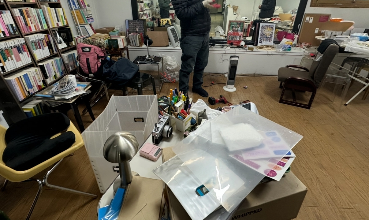 우선 바닥 곳곳에 남은 물 웅덩이를 대걸레로 닦아냈다. 불행 중 다행으로 상수도가 터져서 더러운 물은 아니라고 하지만, 곳곳의 물들은 흙탕물처럼 검고 갈색을 띠고 있다. 그 흔적은 아주 선명히도 남아있어 나는 곳곳을 닦고 또 닦는 수밖에 없었다. 아직 물의 흔적이 남아있고, 뭐가 멀쩡하고 아닌지를 파악하지 못한 상황이라 전기도 사용이 불가했다. 한파의 여파로 여전히 날은 너무 춥고, 자꾸 찬물에 손이 닿으니 몸은 점점 얼어갔다. 일단은 바닥의 물들만 치운 뒤, 다음날 다시 와서 정리를 이어가기로 했다.