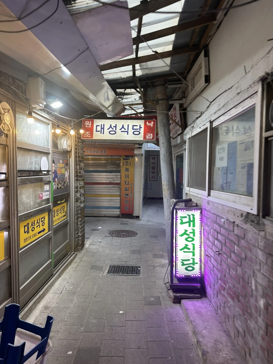 이번 미식기행의 첫 번째 소개할 곳은 을지로 대림상가 옆에 위치한 좁다란 골목 틈에 자리한 ‘대성식당’입니다. 책방 퇴근시간 즈음에 배가 고파 근처에 맛집을 알아보다 발견하여 후다닥 가보았어요.
