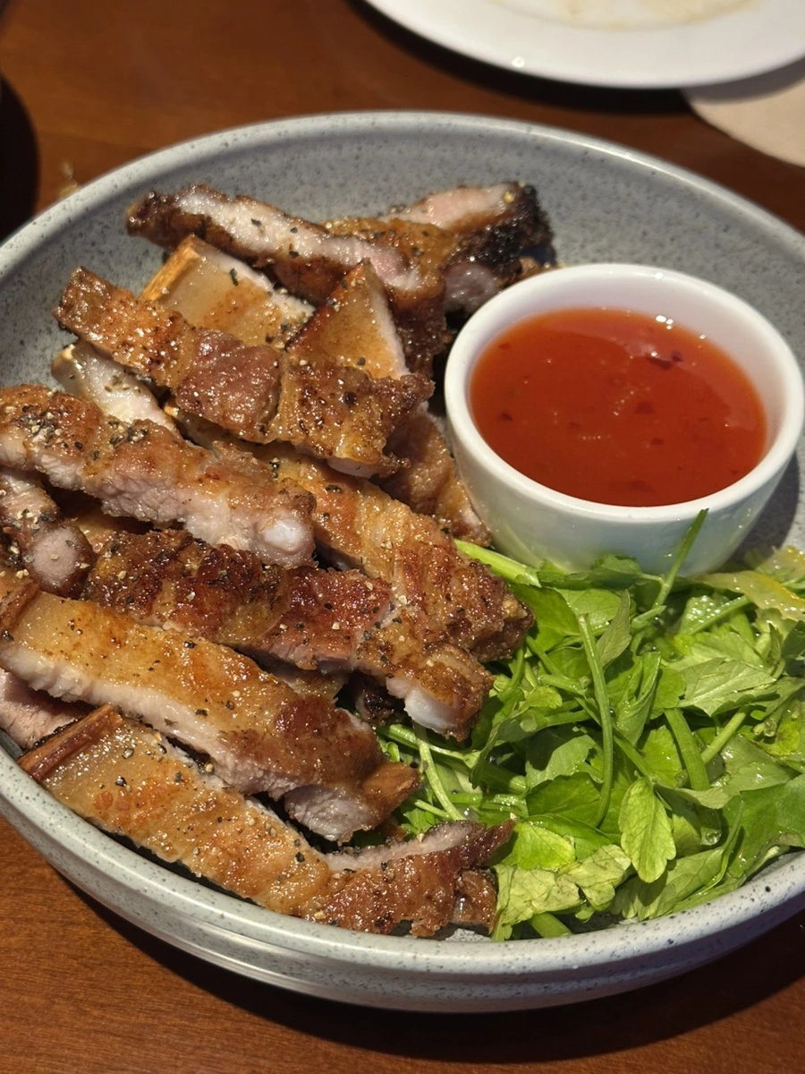 그리고 이건 목살을 구워서 고수와 칠리소스를 찍어먹는 메뉴인데, 아아 이름이 또 생각 안 나네요.. 이게 생각보다 너무 맛있어서 와인과 함께 잘 먹었어요. 바삭하게 구워서 잡내 없이 손이 자꾸 가더라고요. 특히 고수와 칠리소스를 곁들여 먹으니 왜 이리 맛있던지.. 정말 이렇게 새로운 맛도리 조합을 알게 되었어요.