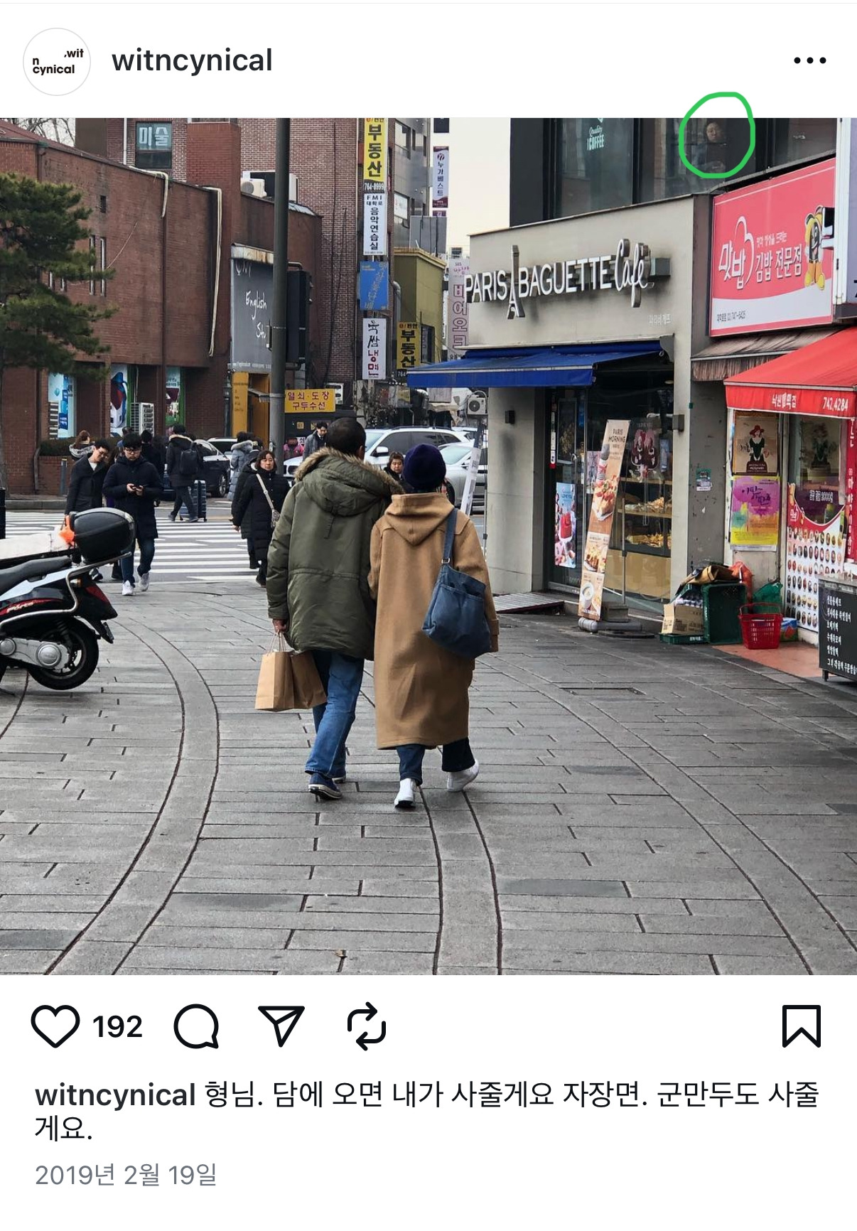 2019년 어느 겨울날, 여느 때와 같이 카페에 앉아 바깥을 바라보던 참이었다. 위트 앤 시니컬 아저씨와 함께 어떤 남자와 여자가 동양서림에서 밖으로 나오는 순간을 우연히 포착하게 된 것이다. 희한하게도 그날따라 아저씨는 맨날 짓는 그 시큰둥한 표정이 아닌 아주 밝은 표정에 심지어 함박웃음까지 지어 보이며, 대화를 나누는 게 아닌가. 도대체 누굴까 하는 궁금증으로 바라보던 찰나, 남자와 여자는 아저씨와 헤어졌다. 그리고 그 두 사람의 뒷모습을 찍는 아저씨. 애틋한 관계처럼 걸어가는 두 사람의 뒷모습을 아련하게 바라보며 사진까지 찍는 그 아저씨를 보고 있으니 뭐랄까, 늘 시니컬한 표정만 짓던 사람의 색다른 이면을 본 것 같아 자꾸만 쳐다보게 되었다. 그리고 잠시 뒤 난 창문에서 시선을 거두고, 다시 테이블 위의 책을 읽기 시작했다.