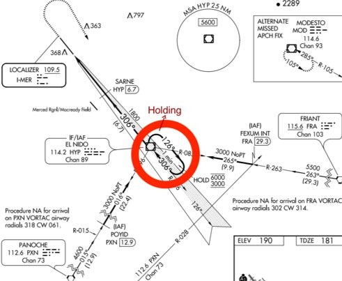 해당 공항 근처에 Traffic이 많아서 바로 착륙이 안 될 경우 공항 근처에서 대기해야 할 때, Holding 메뉴버 절차를 따른다. 그림에서 표시된 대로 동그랗게 원을 그리면서 대기하는 메뉴버다.