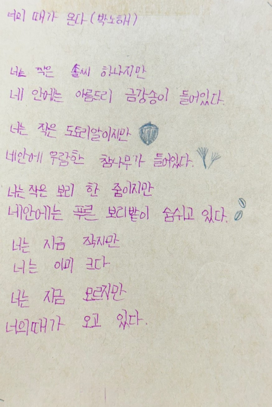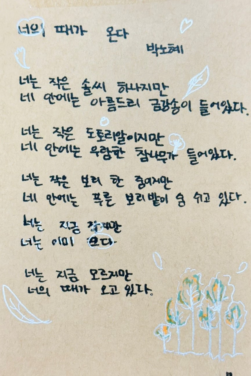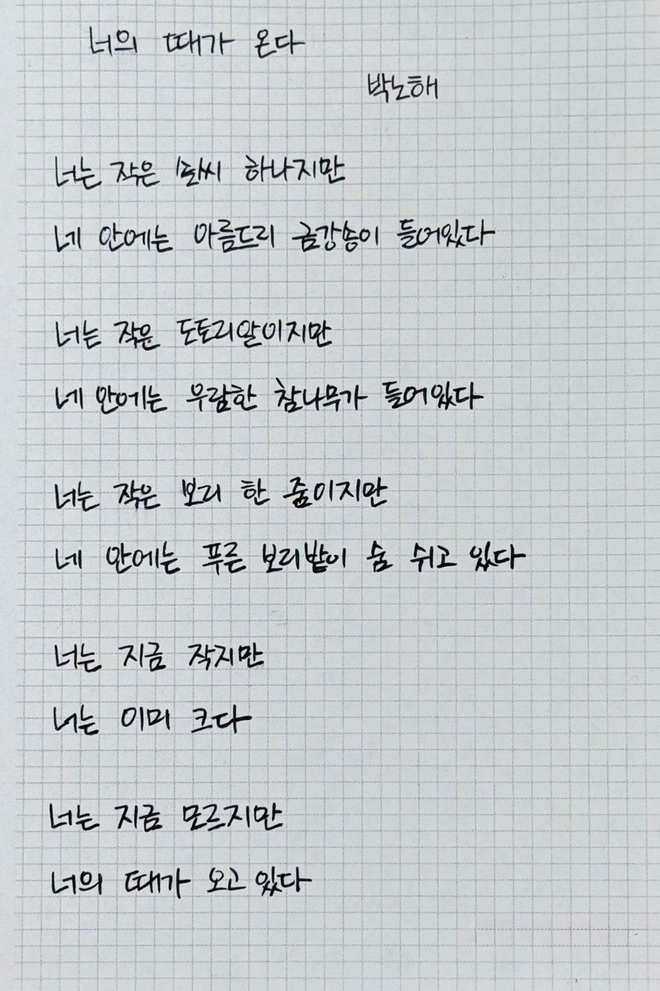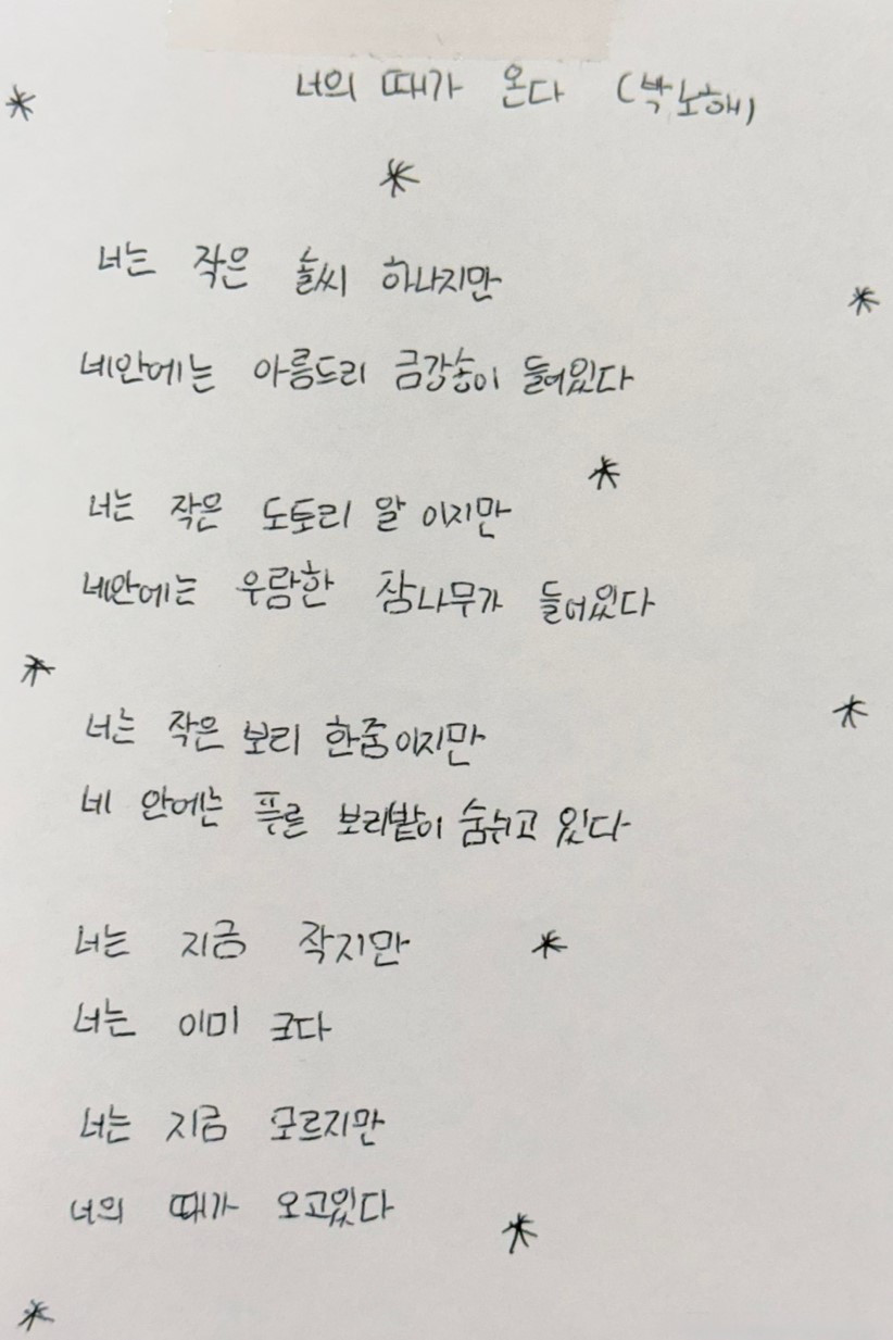 화면에 띄워둔, 우리가 4월에 같이 필사했던 박노해 시인의 시, '너의 때가 온다.'를 함께 읽어보아요.