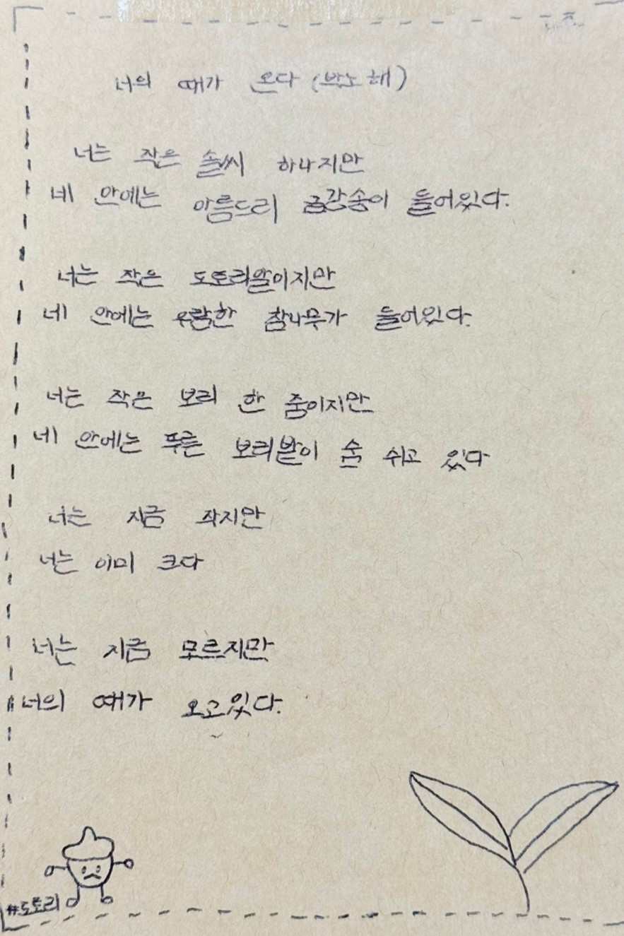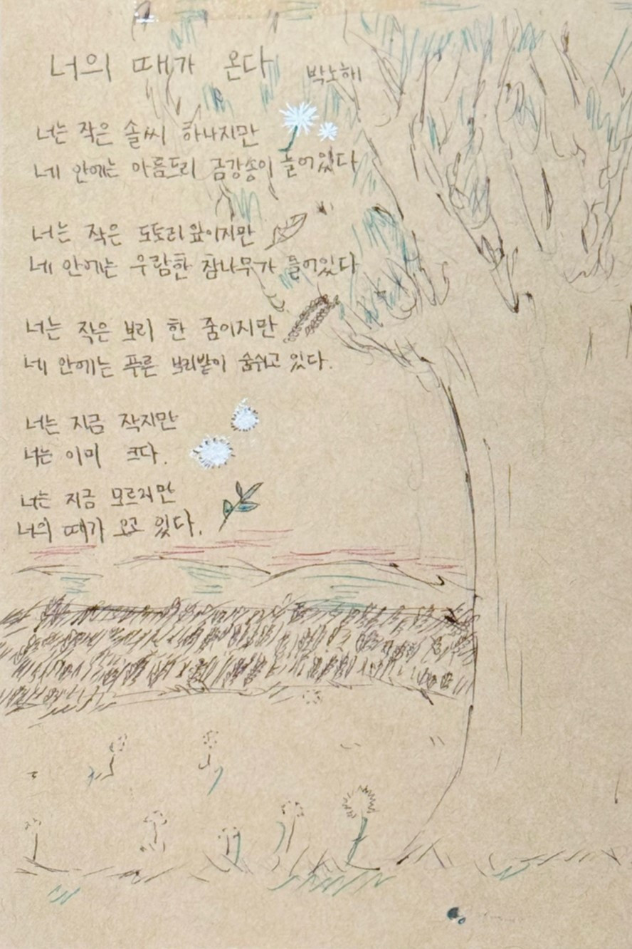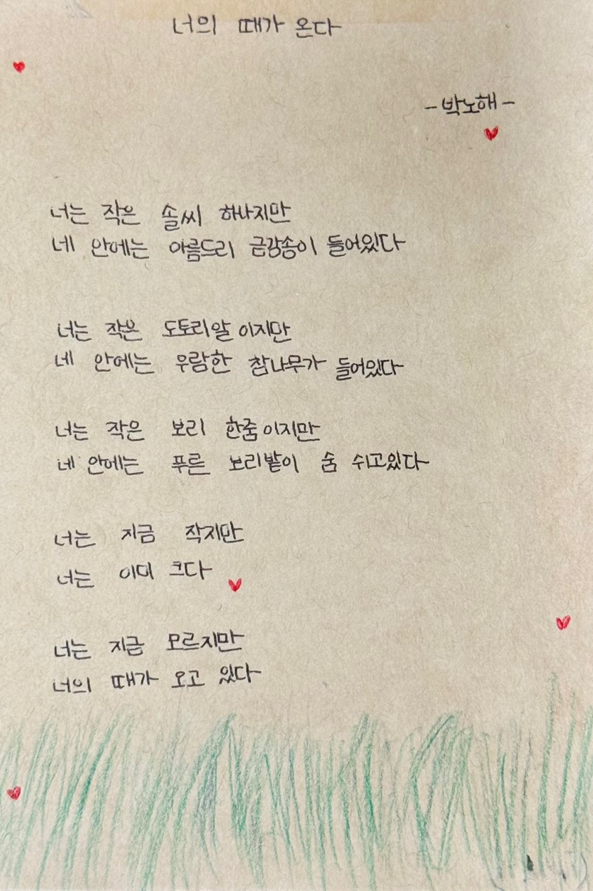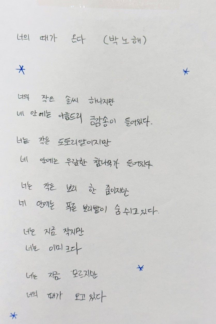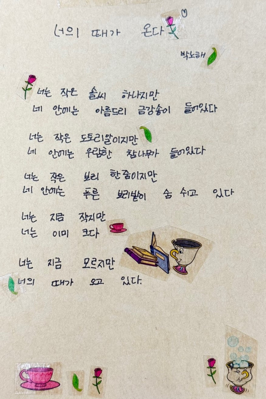 화면에 띄워둔, 우리가 4월에 같이 필사했던 박노해 시인의 시, '너의 때가 온다.'를 함께 읽어보아요.