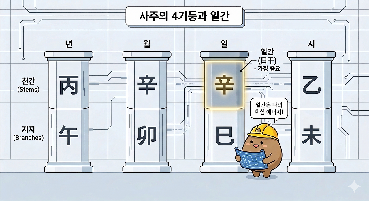 사주 해석의 핵심은 내가 태어난 날의 천간, 즉 '일간(日干)'이다. 일간은 나라는 구조물의 '코어'이자 핵심 에너지다. 이 일간을 중심으로 나머지 글자들이 나를 돕는지, 혹은 하중을 가하는지를 분석하는 것이 사주 해석의 시작이다.