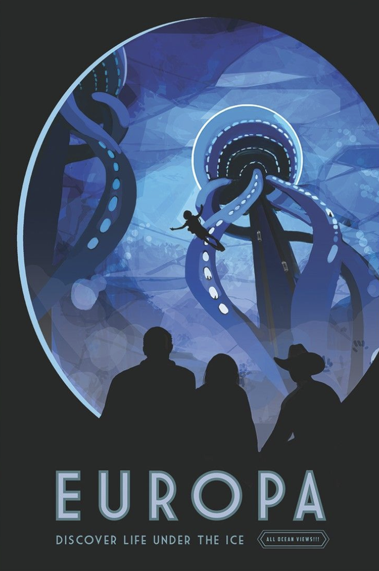 이 중 유로파는 얼음으로 덮여 있으며, 지하에 액체 바다가 있을 것으로 추정된다. NASA가 제작한 기발한 여행 포스터는 미래 탐험가들이 유로파의 얼음 지각 아래 바다에서 살고 일하는 모습을 상상한 것이다.