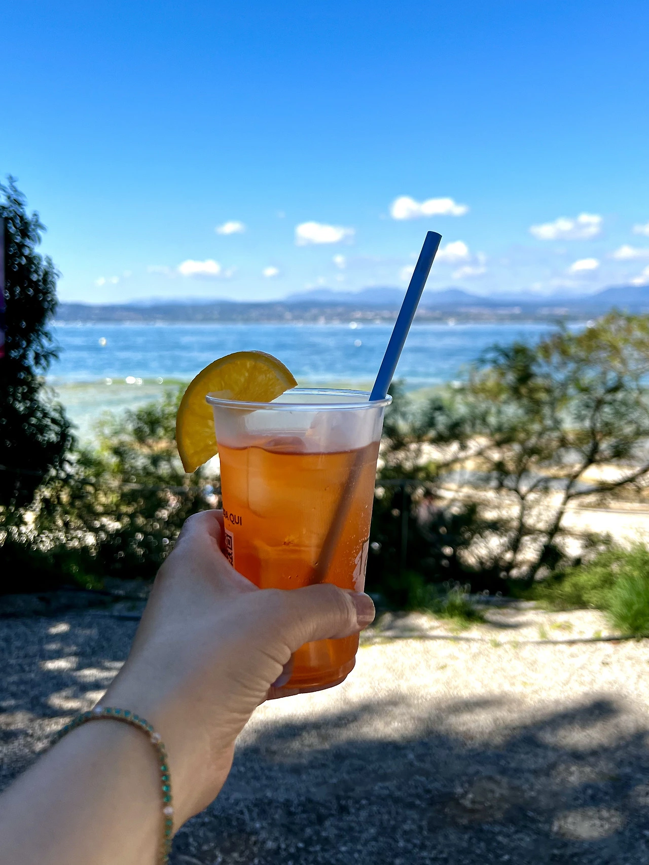 준비 없이 온 탓에 일광욕도 수영도, 온천욕도 할 수 없었지만, 호숫가 바(Bar), 전망이 좋은 자리를 잡았다. 나폴리에서 다 마시지 못했던 오렌지빛 술, 스프릿츠(Spritz)를 주문했다. 옆 자리 독일 가족의 유쾌한 수다를 배경 삼아 홀짝이다 보니 기분 좋게 술기운이 올랐다. 가방에서 파도바 시장표 납작 복숭아를 꺼내 한 입 베어 물었다.