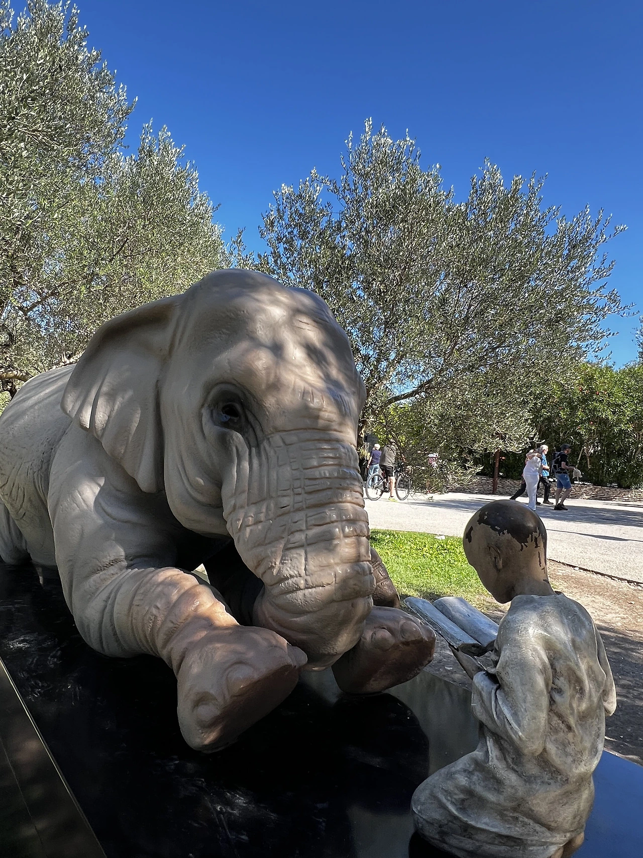 나는 돌아섰다. 하얀 바지에 아끼는 가죽 셔츠까지 입은 나그네에게 수중 행군은 허락되지 않았다. 대신 올리브 나무가 뒤덮인 언덕을 올랐다. 길 위에서 뜻밖에도 코끼리와 공부하는 동자스님 동상을 만나 인사를 나눴다. 언덕 아래로 내려가자 너럭바위가 깔린 해변이 나타났다. 찰랑이는 에메랄드 호수 수면 아래, 넓고 평평한 바위들이 깔린 풍광이 독특했다. 그곳에 물길을 건너간 커플과 검은 개가 먼저 도착해 있었다. 물길을 헤쳐가든, 언덕을 넘어 땅으로 오든 결국 목적지는 다르지 않았다. 우리는 같은 바위 앞에서 다시 마주쳤고, 가벼운 눈인사를 교환했다.