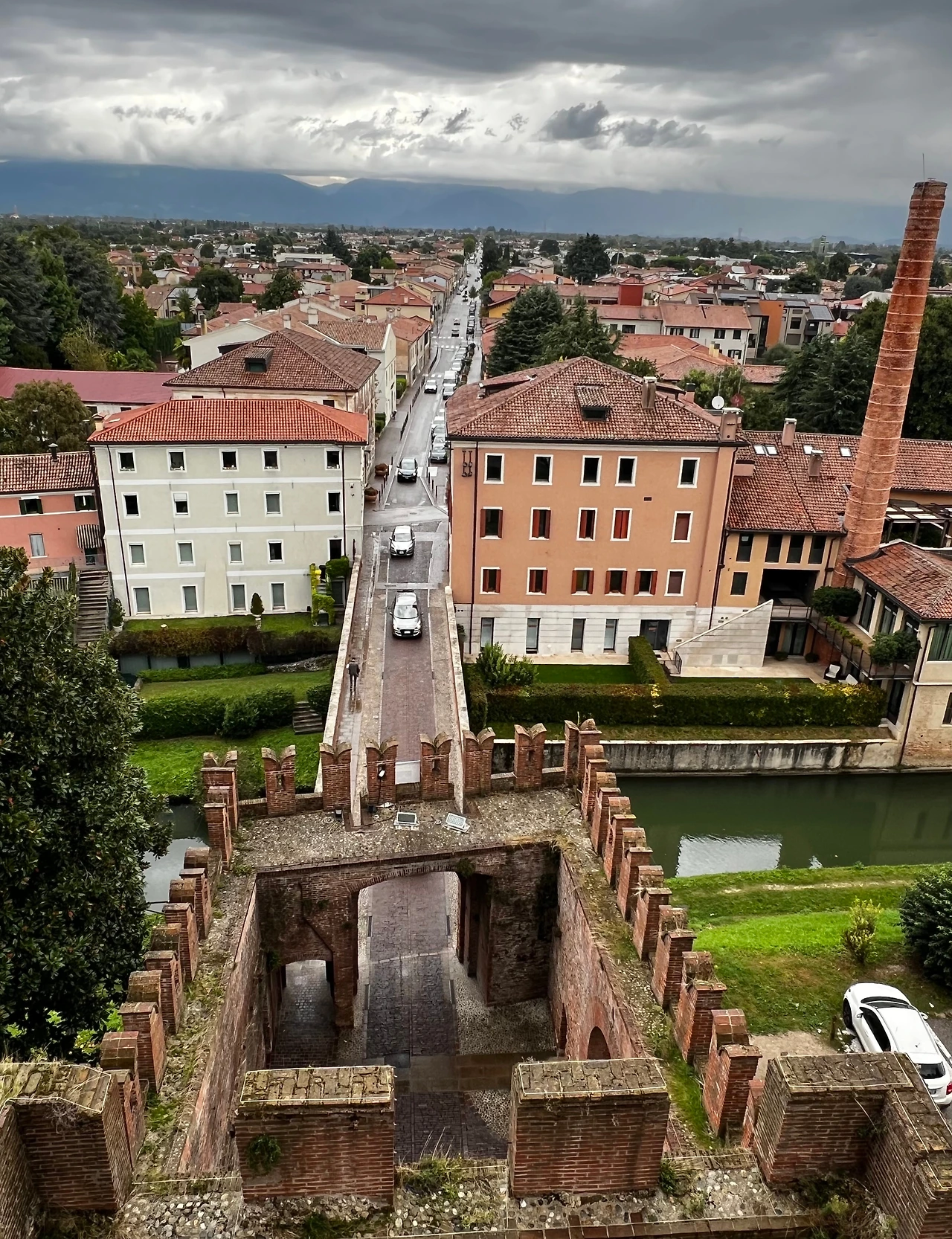 날씨 때문일까, 성벽 위에는 중년 부부와 나, 단 두 팀뿐이었다. 성벽 안으로는 낮은 지붕들이 옹기종기 모여 정겹고, 밖으로는 360도 방사형으로 뻗은 도로와 마을이 한눈에 들어왔다. 북쪽으론 병풍처럼 우뚝 선 알프스 능선이 위용을 드러내고, 성을 둘러싼 초록 해자와 성문이 굳건히 자리를 지킨다. 일부 훼손된 구간은 보수 중이었지만, 성채와 방어 시설은 놀라울 만큼 원형을 유지하고 있었다. 옛 순찰로를 따라 성벽 전체를 한 바퀴 도는 내내 감탄이 터져 나왔다.