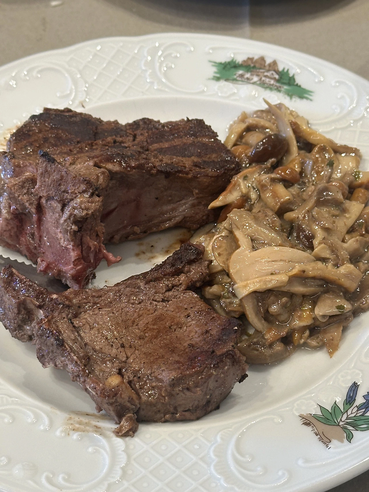 치즈와 옥수수 가루로 만든 폴렌타가 곁들여진 고기 플래터. 거기에 버섯을 얹은 사슴 스테이크와 와인까지.