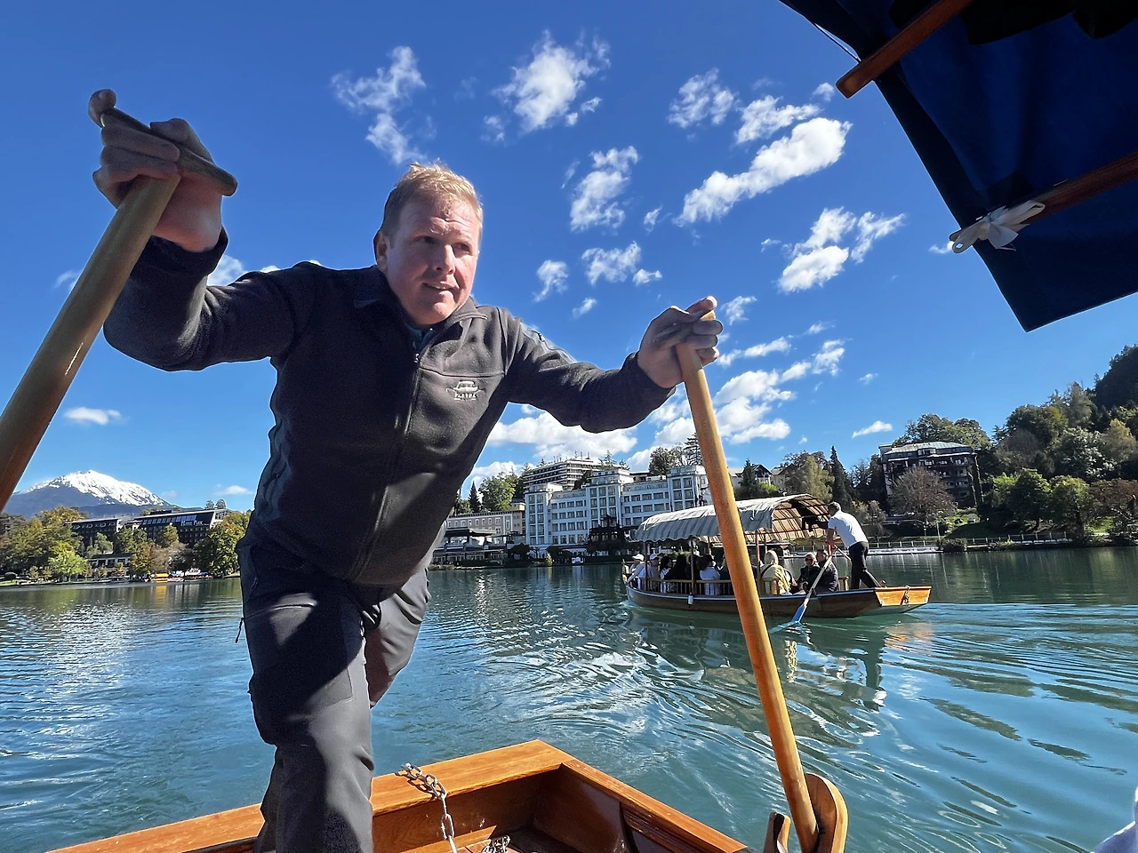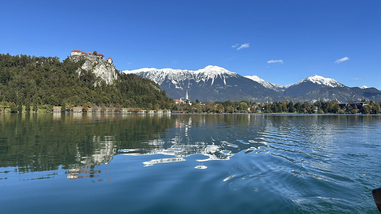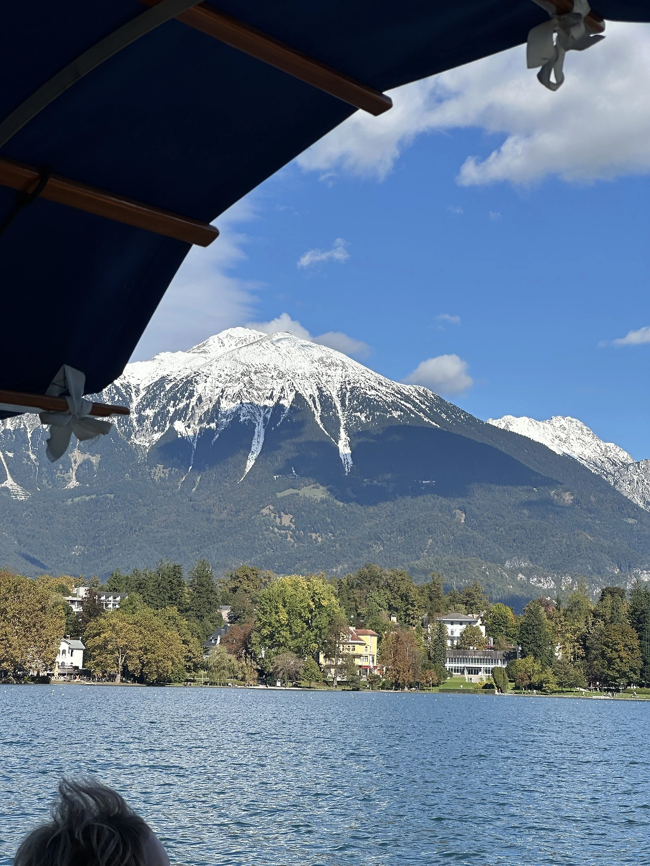 초록 물을 가르며 배가 출발했다. 성인 16명이 타서 묵직해진 배. 뱃사공이 우리를 정면으로 마주한 채 노를 젓는다. 무동력으로, 오롯이 뱃사공의 어깨와 노 젓는 기술에 의지해 배는 나아갔다. 호수 중앙으로 나가자, 언덕에 가려졌던 눈 덮인 알프스가 나타났다. 탄성을 지른다. 닿을 듯 가까워 보였던 블레드 섬은 생각보다 멀었다.