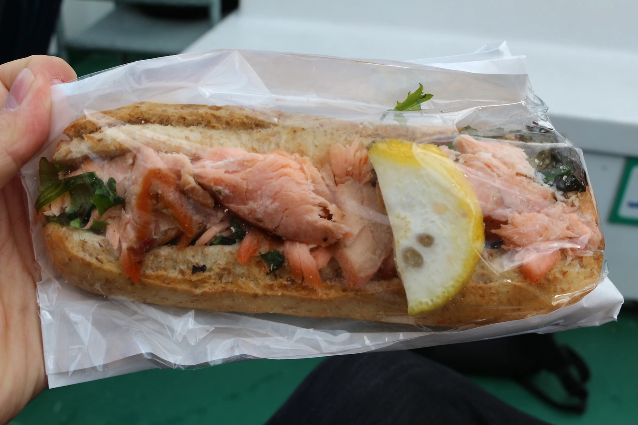 잠시 기념품샵을 둘러본뒤에 우리는 플롬으로 가기위해 페리로 갈아탔다. 페리에 타자마자 우리는 점심으로 어시장에서 사온 해산물 샌드위치를 먹었는데, 가격은 70크로네 정도지만 적당한 가격에 적당한 맛인것같았다.
