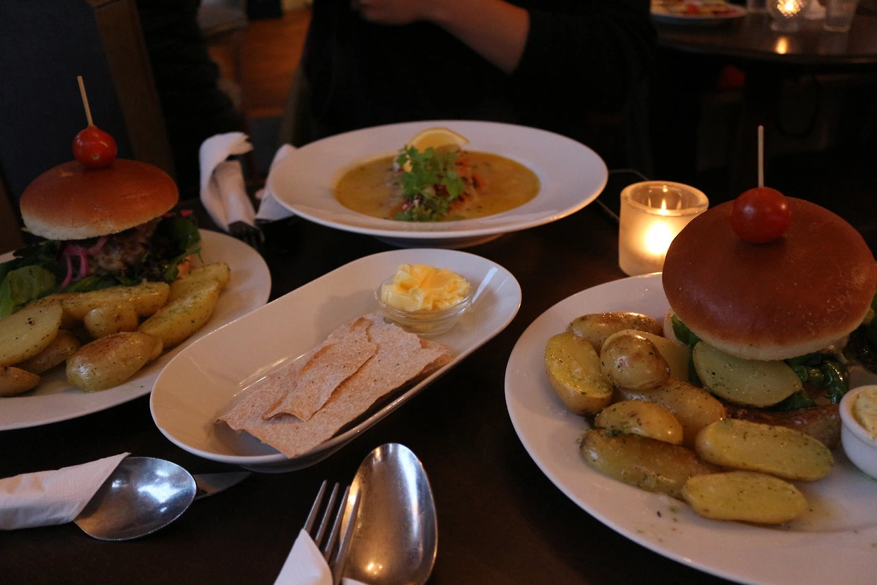 베르겐에 도착한 우리는 주린 배를 부여잡고 먹을것을 찾고있었는데 플롬으로 가는 페리에서 만난 사람이 우리에게 생선스프와 햄버거가 맛있는집을 소개시켜줘서 그 가게를 찾아가서 똑같이 시켜먹었다.