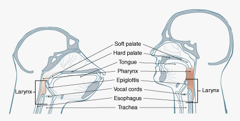 이뿐만 아니라 인두강이 발달해야 합니다. 말을 하는 것은 혀와 입을 움직인다고 다 되는 것이 아닙니다. 인두강은 음식물을 삼킬 때 음식물이 지나는 길이자 코로부터 입을 거쳐 공기가 드나드는 길을 말하는데, 인두강은 일종의 울림통 역할을 하여 다양한 소리를 낼 수 있게 한답니다. 강(腔)은 속이 비어있음을 뜻한답니다. 사람에게는 비강(코 안쪽에 비어있는 공간), 구강(입 안쪽에 비어있는 공간), 인두강(코 뒤부터 후두까지 목 안쪽에 비어있는 공간)이 있습니다. 하지만 침팬지에게는 비강과 구강만이 있을 뿐이죠.