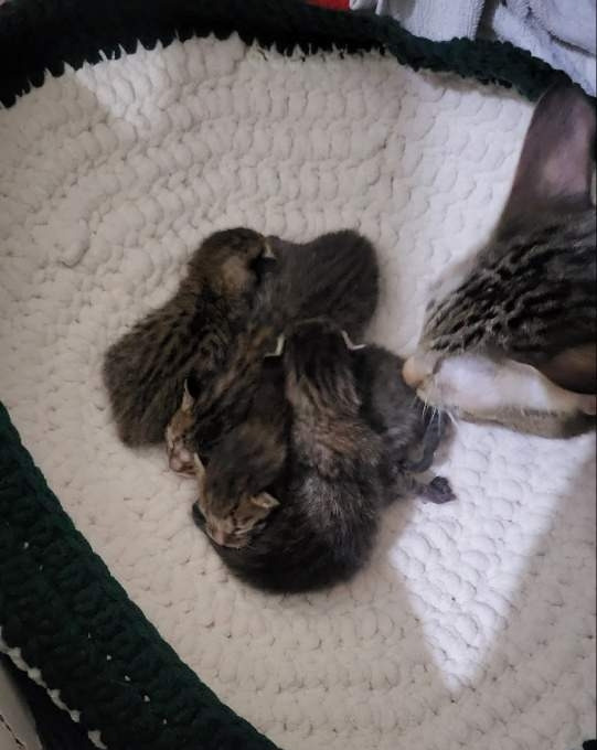 조금 뒤 두 번째 새끼 고양이가 태어났고 한동안 진통이 더 이어지고 나서 세 번째, 네 번째 고양이가 이어서 태어났다.
