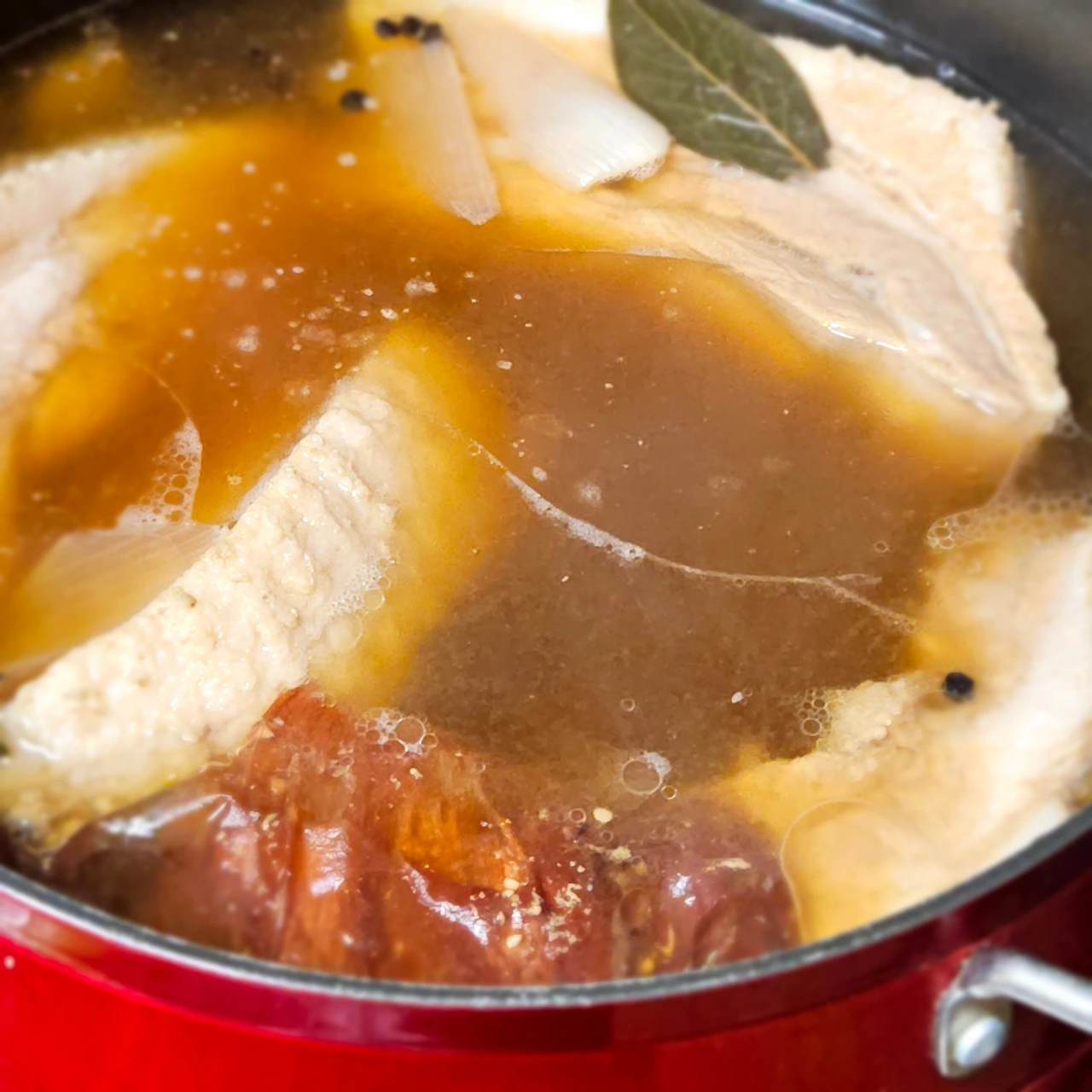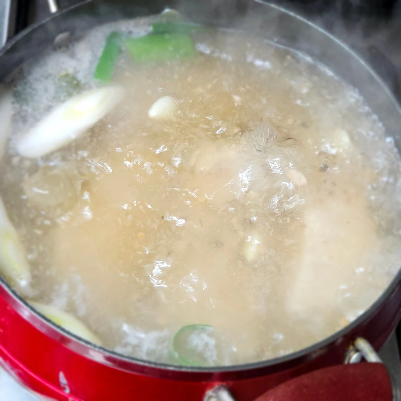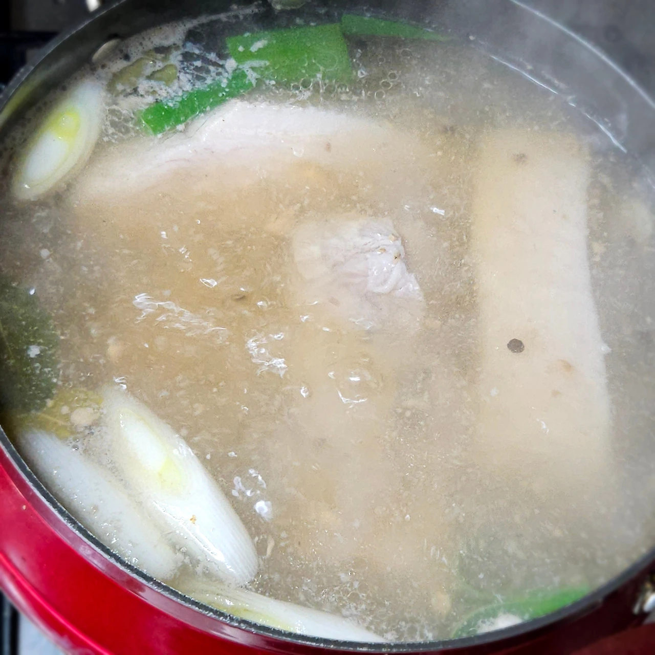 통마늘 4~5개, 양파 1/2개 (양파껍질 함께 사용합니다), 대파 1/2 대, 월계수잎 4~5장, 천일염 1/2 큰술, 통후추 2큰술