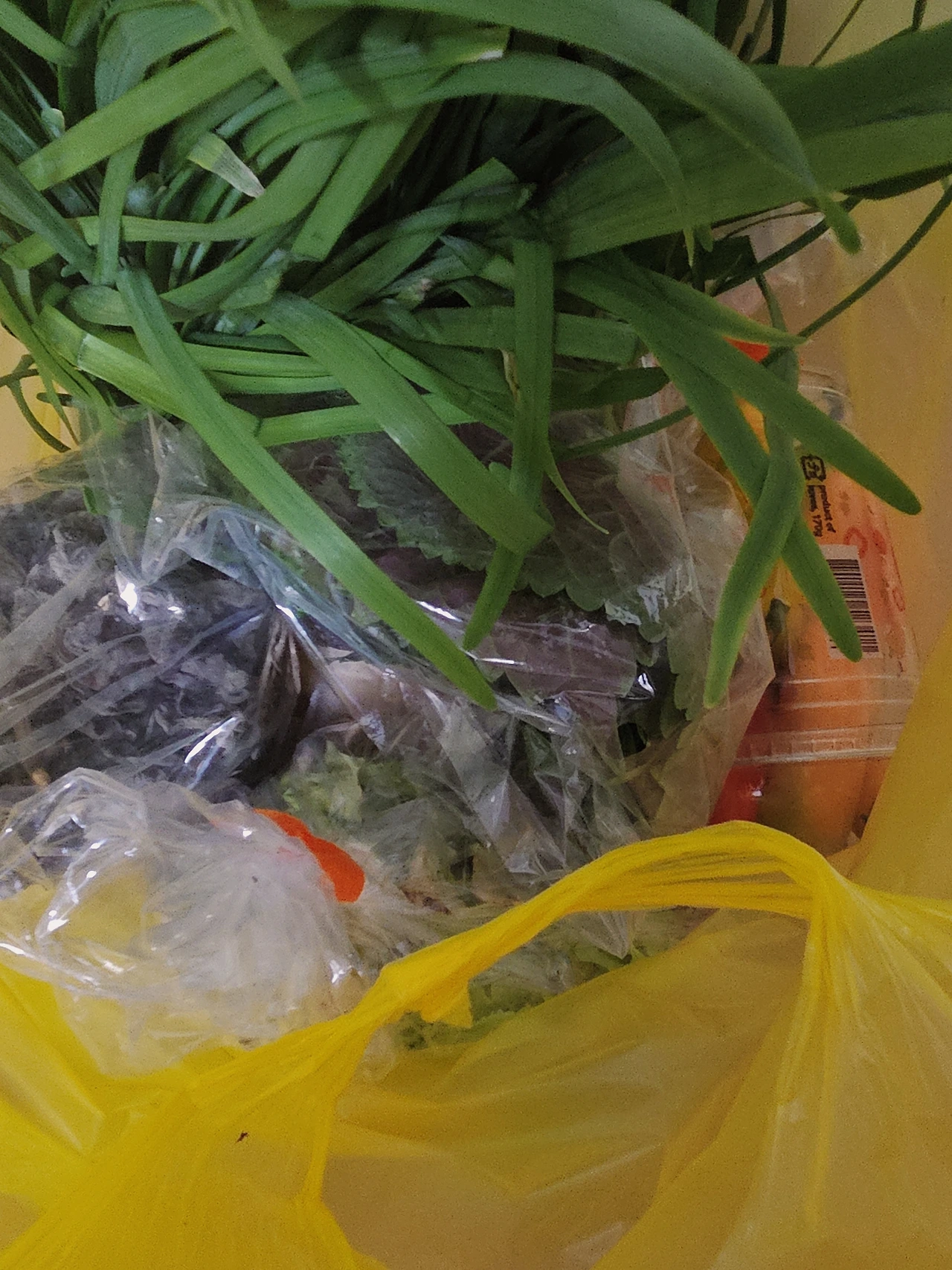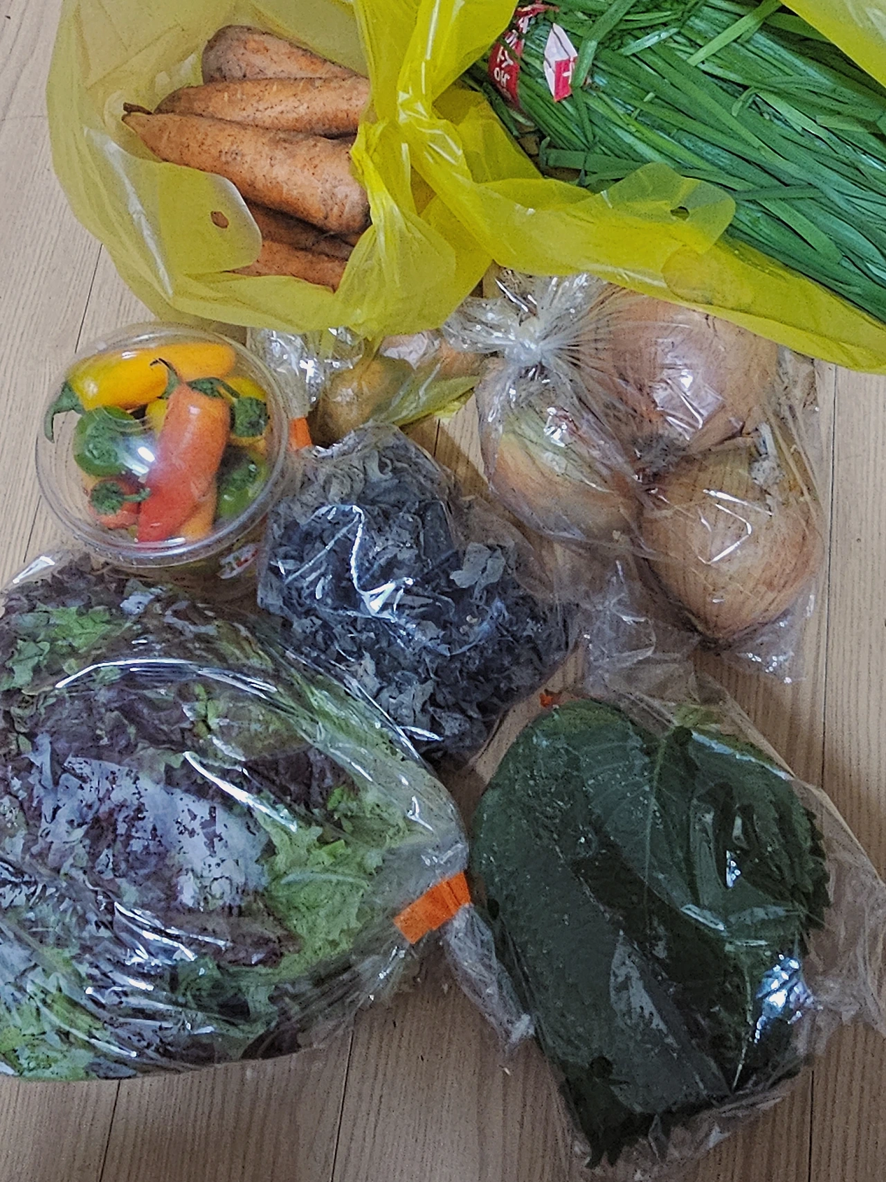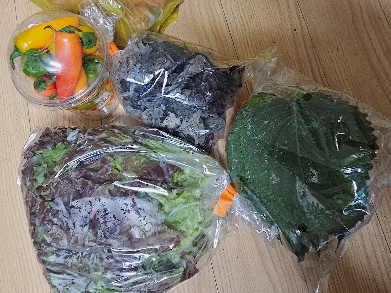 남편이 장봐온 식재료들 상추 깻잎 파프리카 양파 부추 목이버섯 당근 (집에 양파 다 떨어졌는데 어떻게 알았지?)