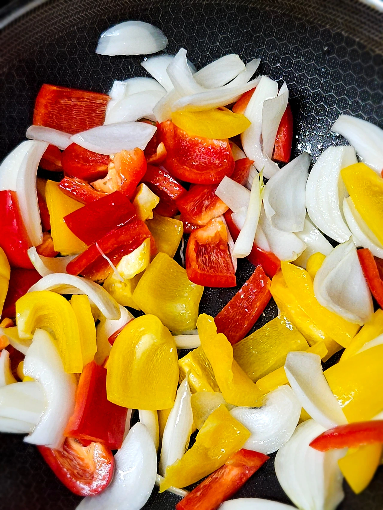 센 불에서 양파, 파프리카 먼저 2~3분 볶아주기