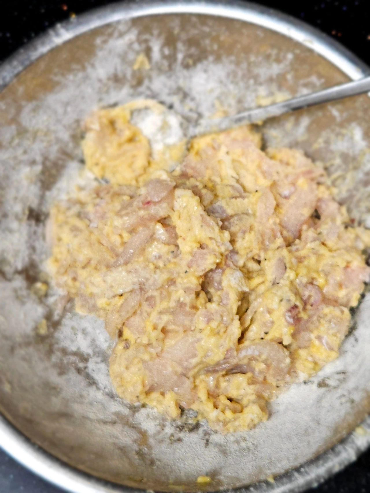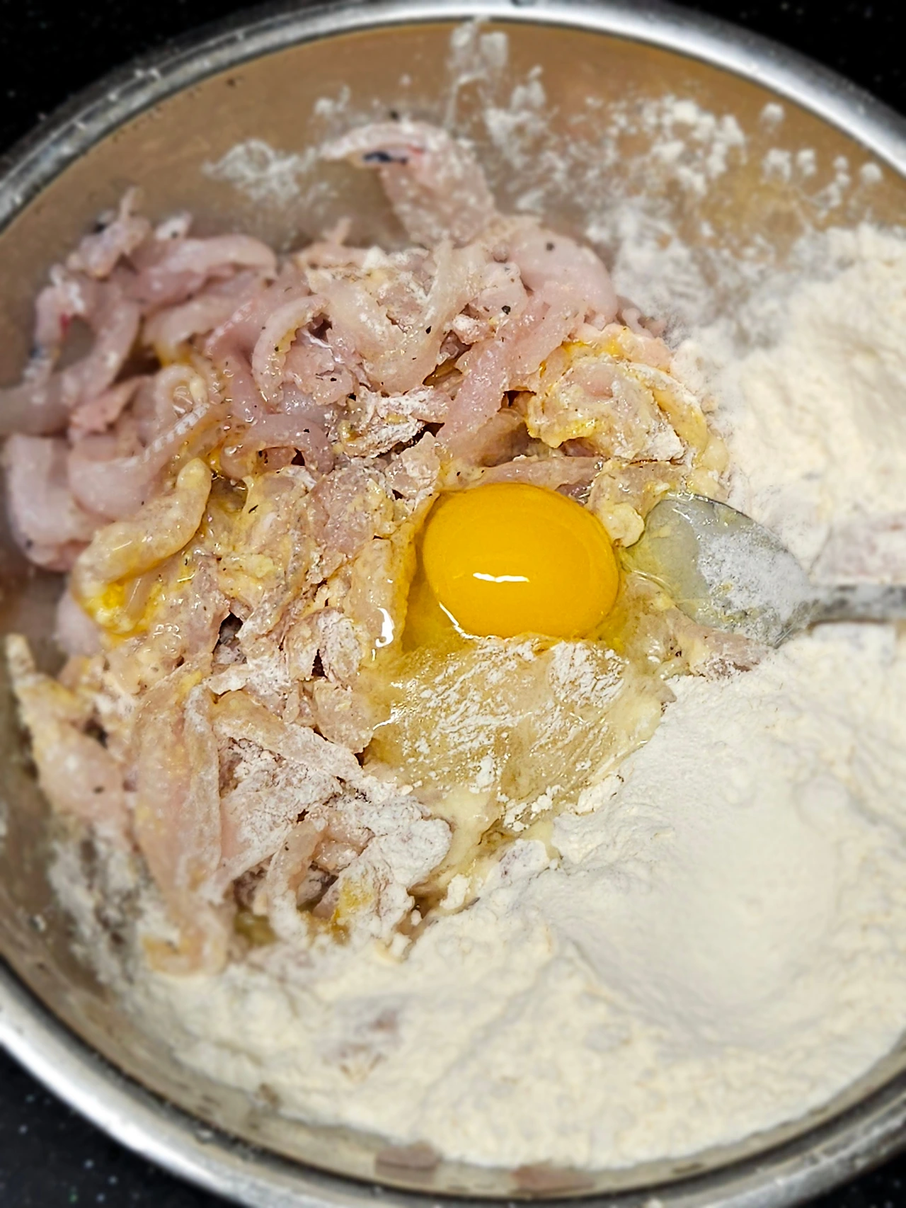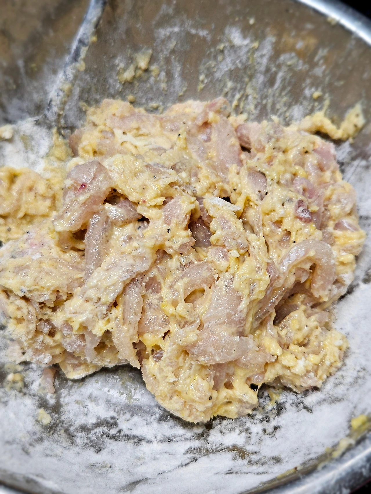 가자미 새꼬시에 소금 후춧가루 양념 살짝 씩 해주고 부침가루 달걀 넣고 잘