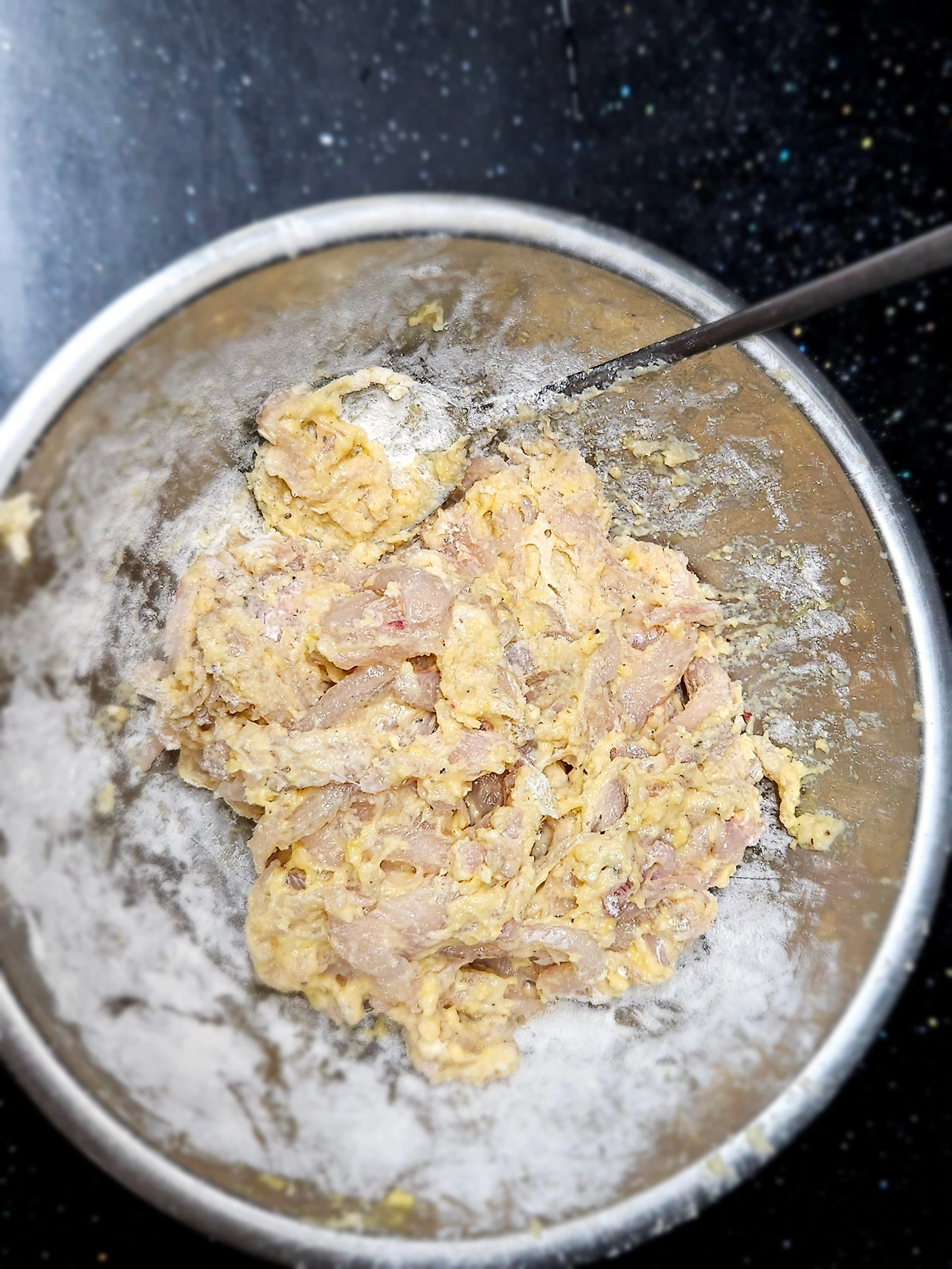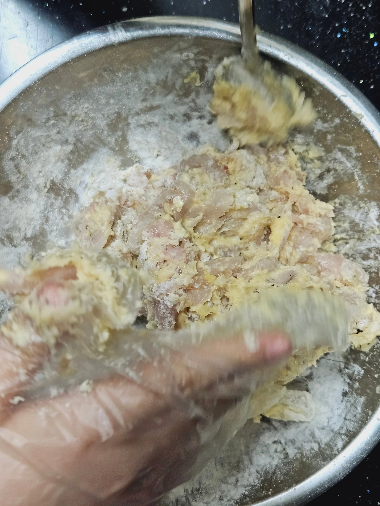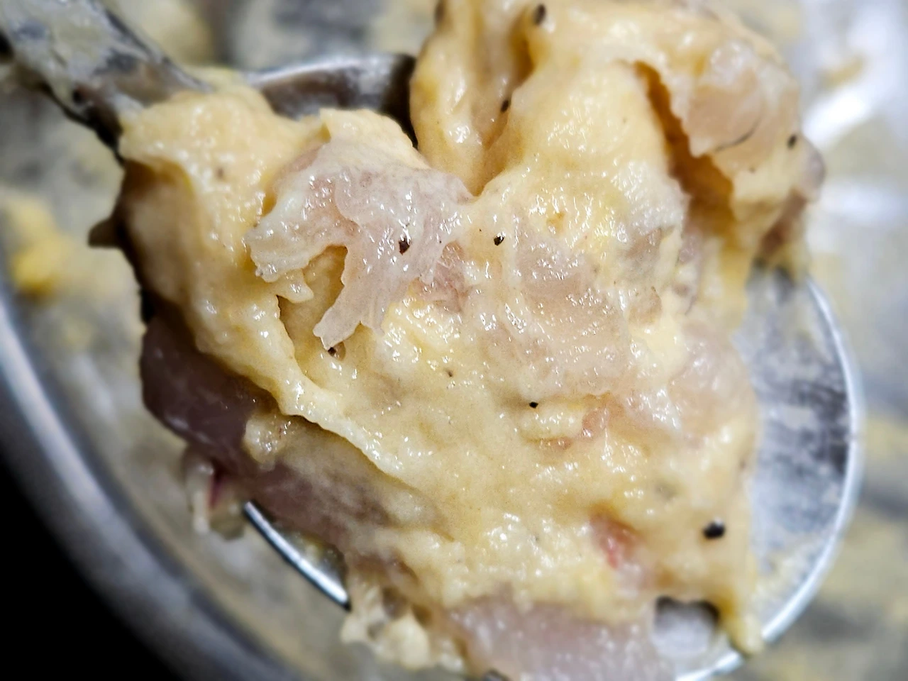 가자미 새꼬시에 소금 후춧가루 양념 살짝 씩 해주고 부침가루 달걀 넣고 잘