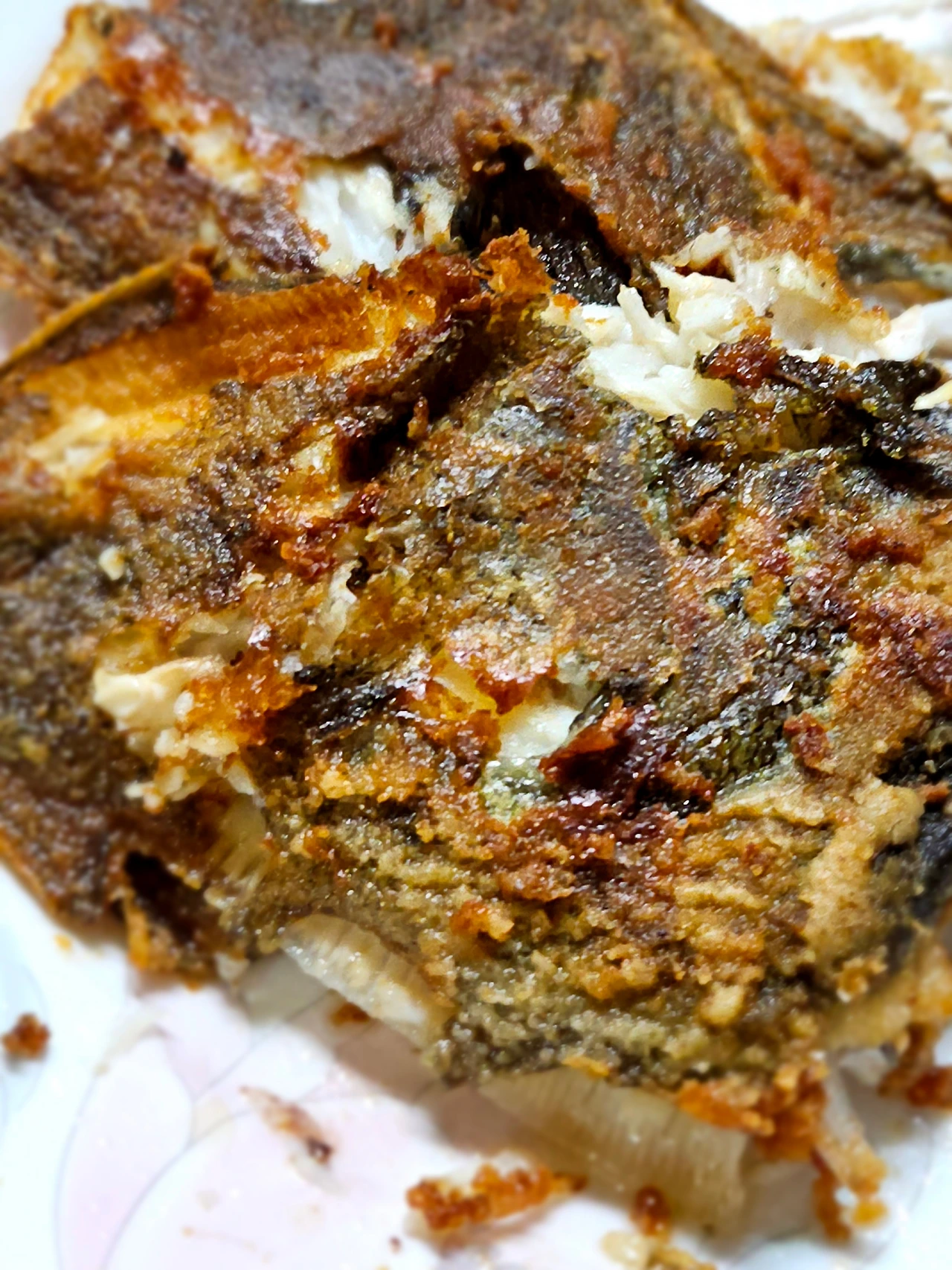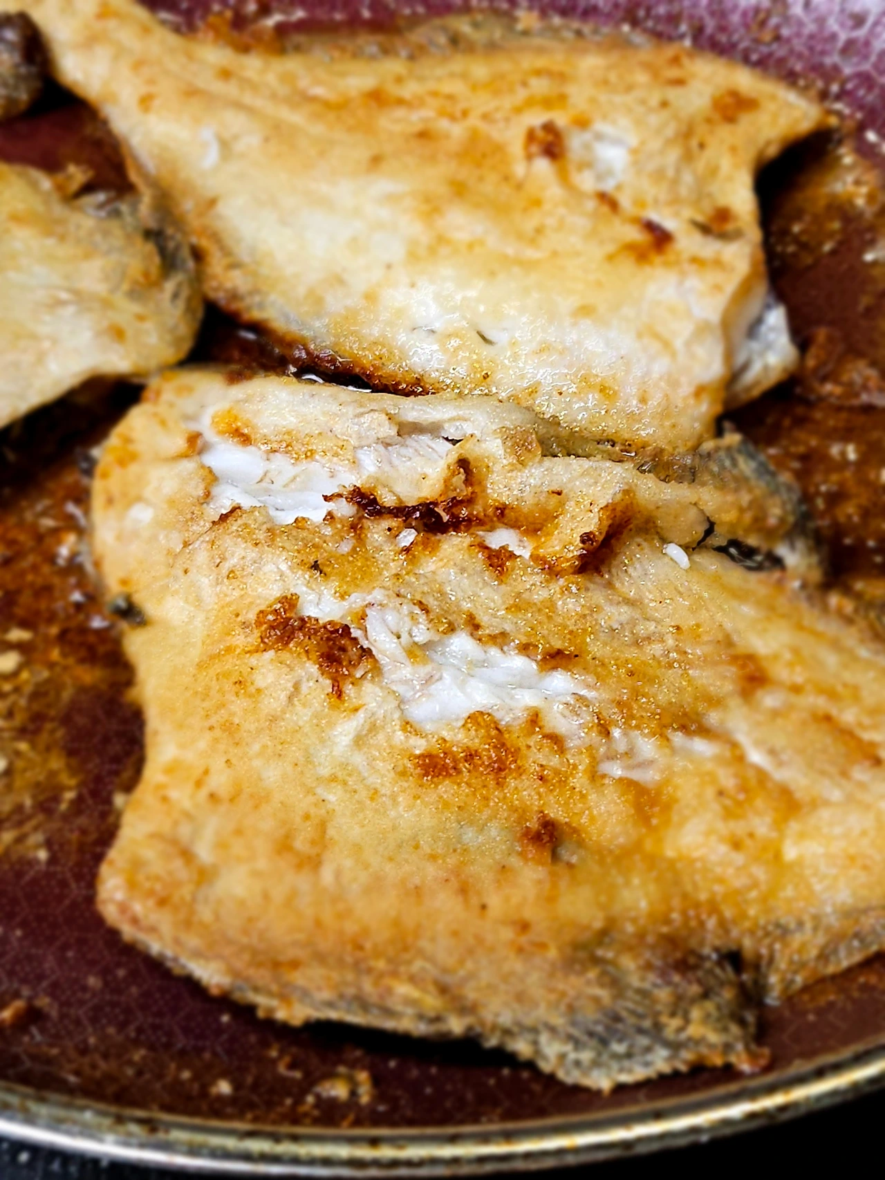 잡아온 가자미는 부침가루 골고루 묻혀서 후라이팬에 구워 먹었어요