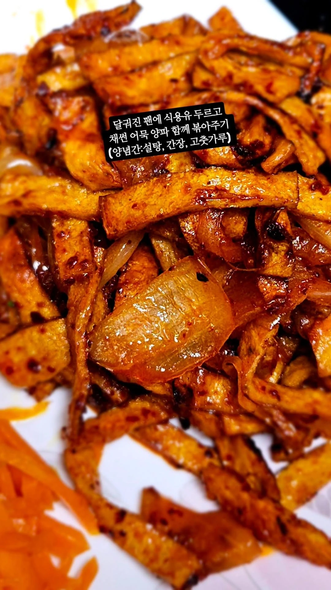 달궈진 팬에 식용유 두르고 채 썬 어묵 양파 함께