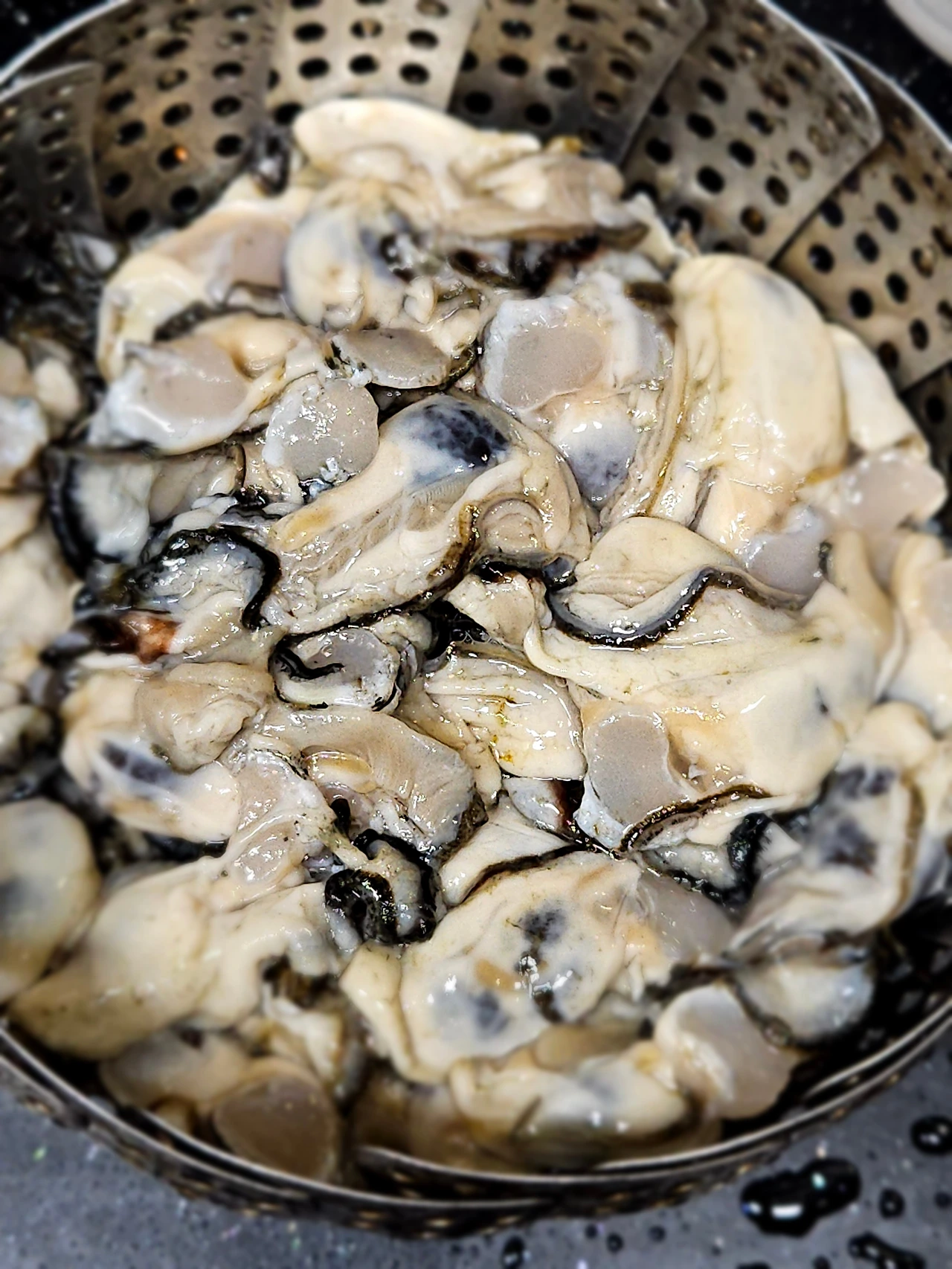 * 잘 세척해서 이물질이 없이 깨끗해진 생굴 채반에 잠시 물기를 빼 줍니다