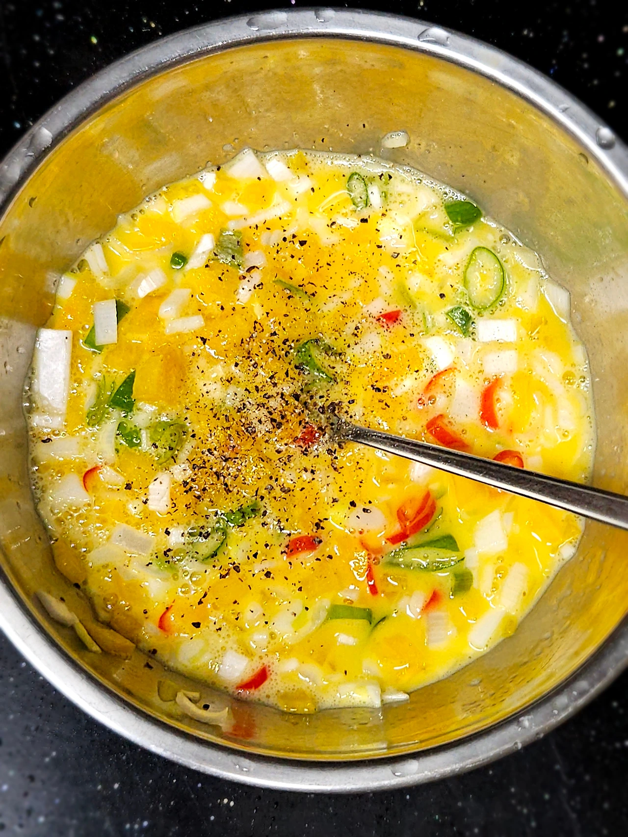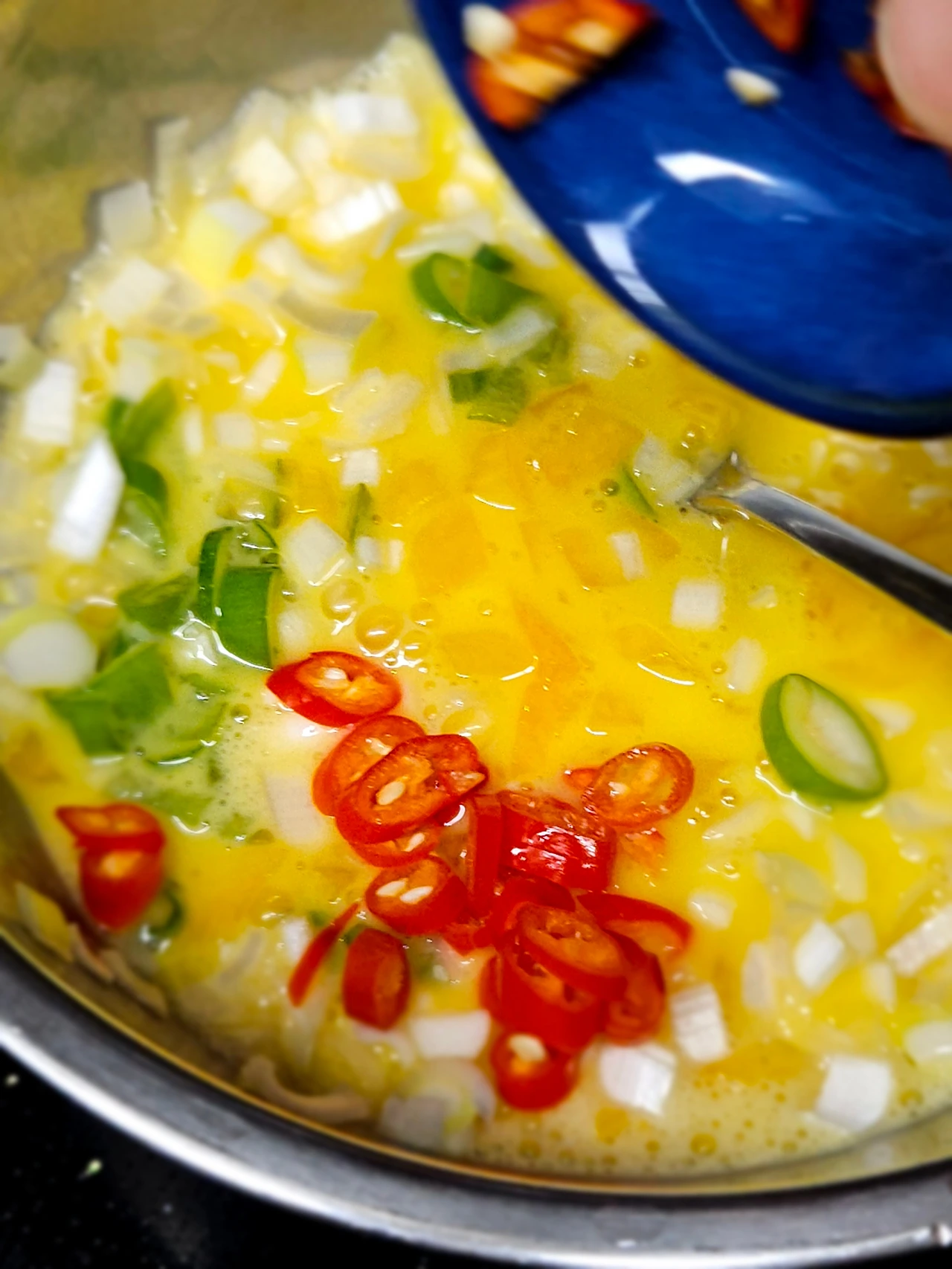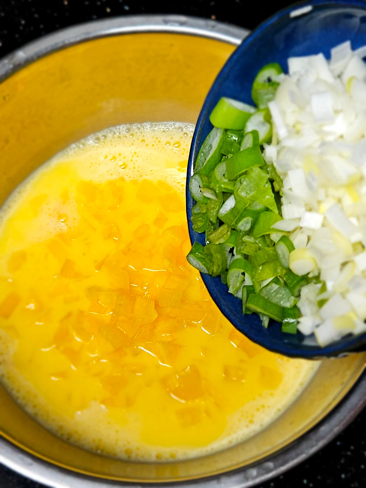 * 잘 풀어서 준비한 계란물에 준비한 파프리카, 대파, 홍고추를 넣어서 잘 섞어줍니다