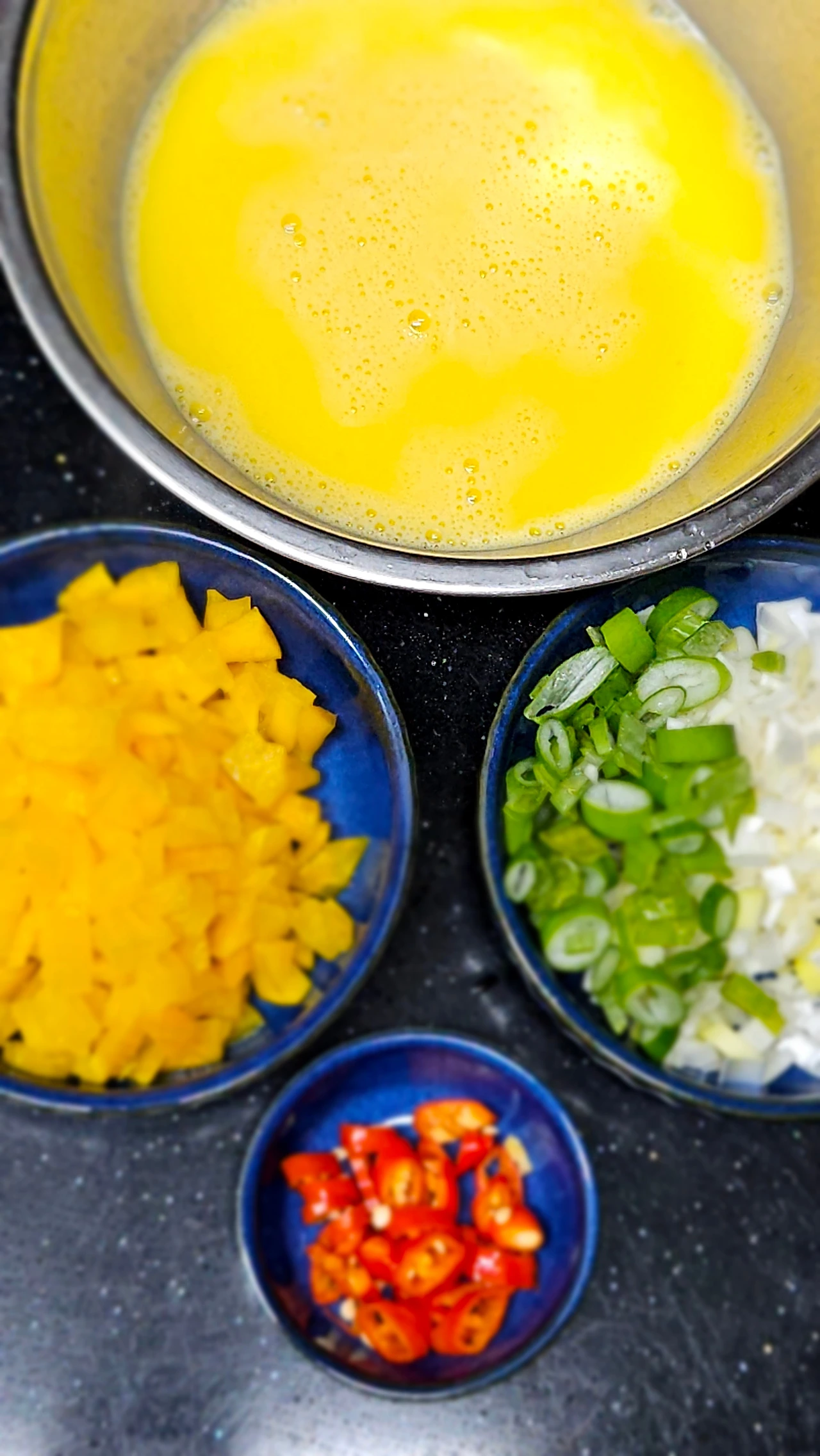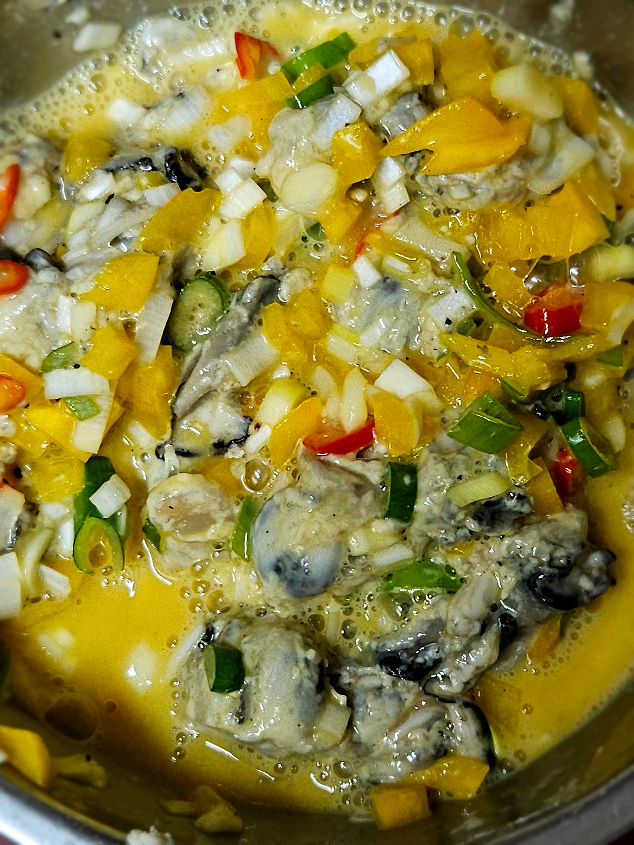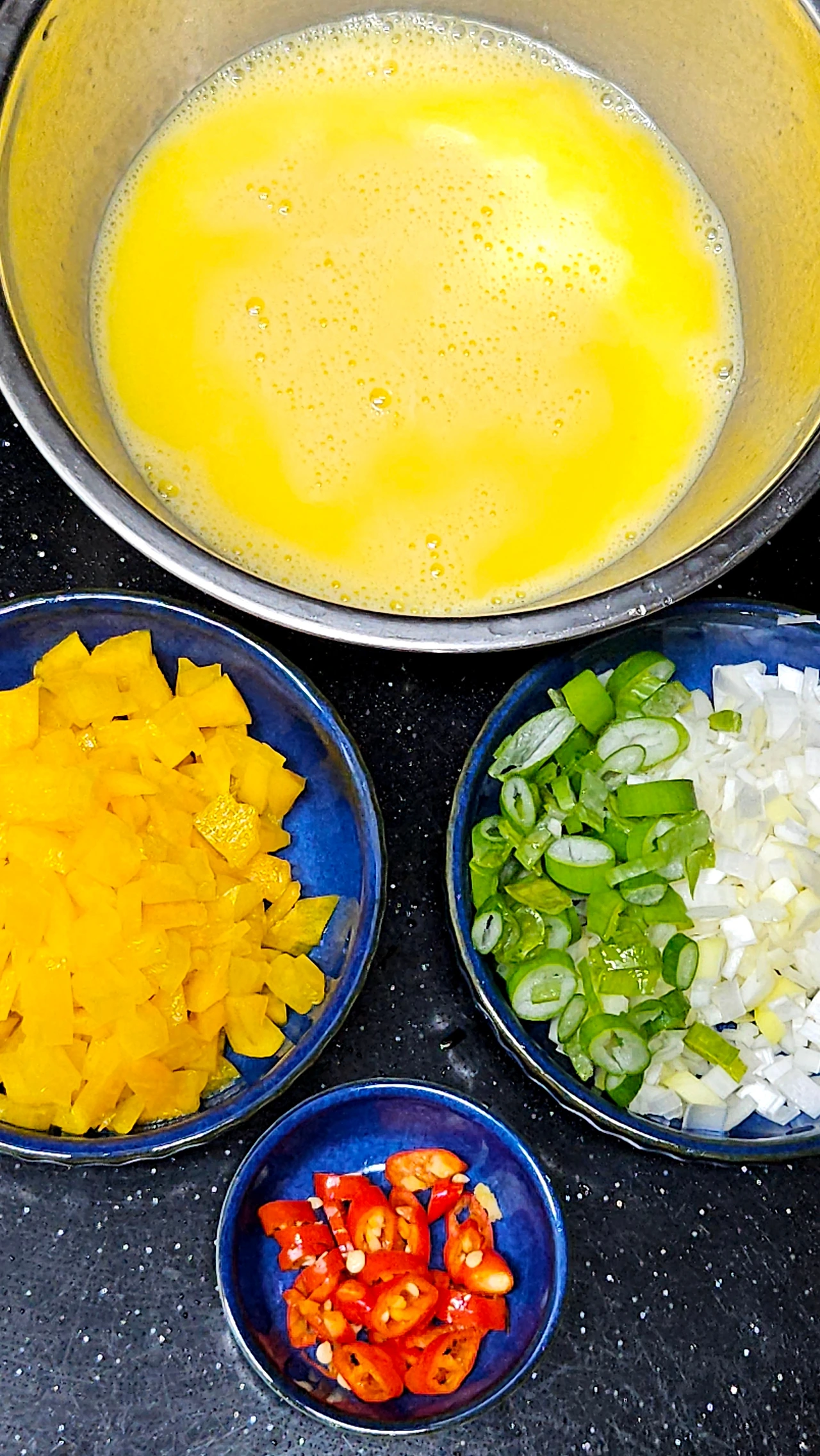 * 잘 풀어서 준비한 계란물에 준비한 파프리카, 대파, 홍고추를 넣어서 잘 섞어줍니다