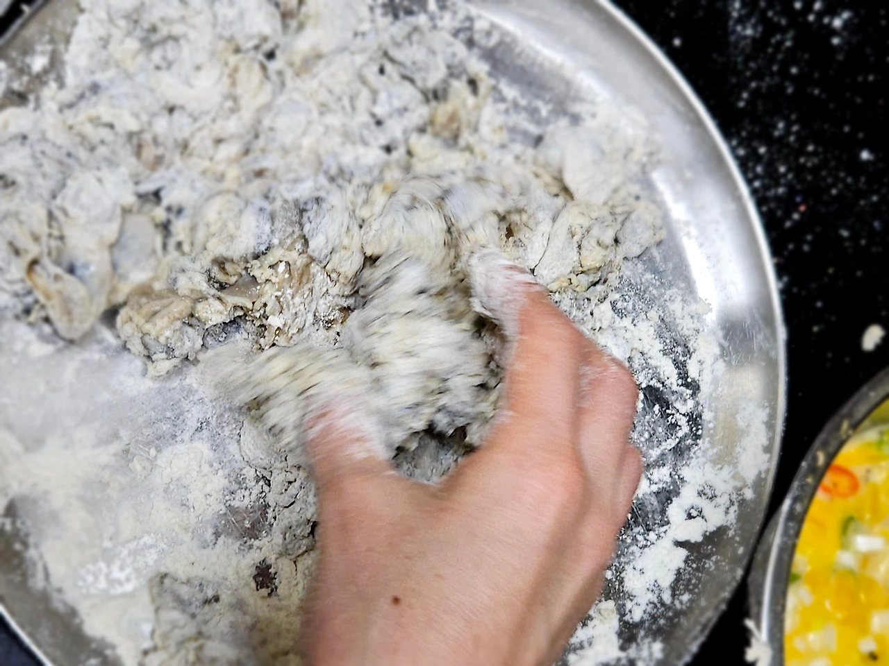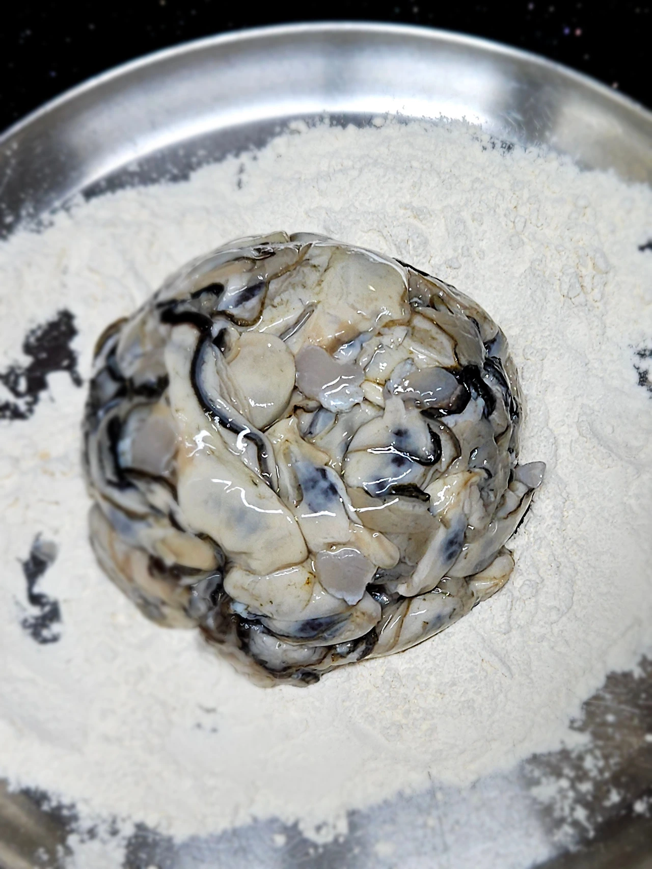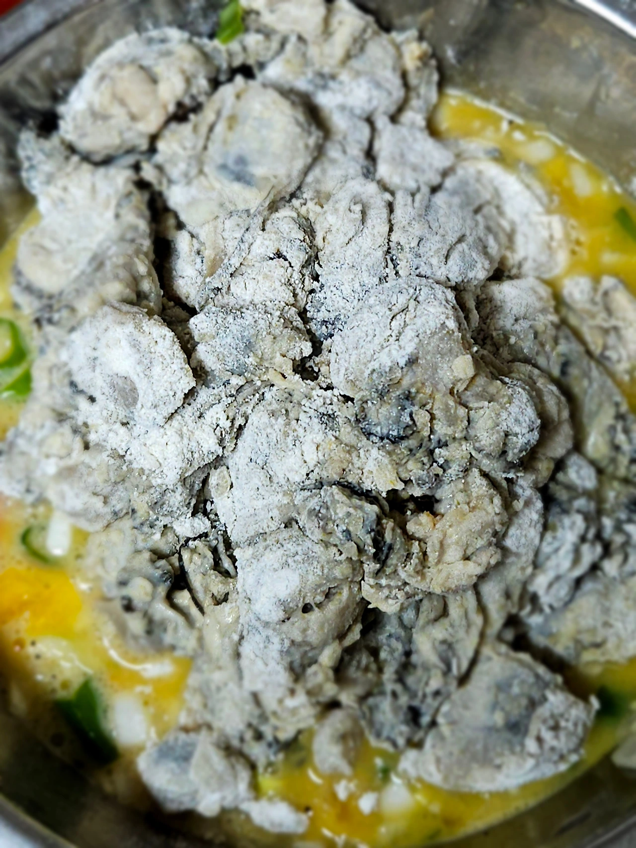 * 부침가루 옷 잎힌 생굴 계란물에 퐁당 넣어줍니다