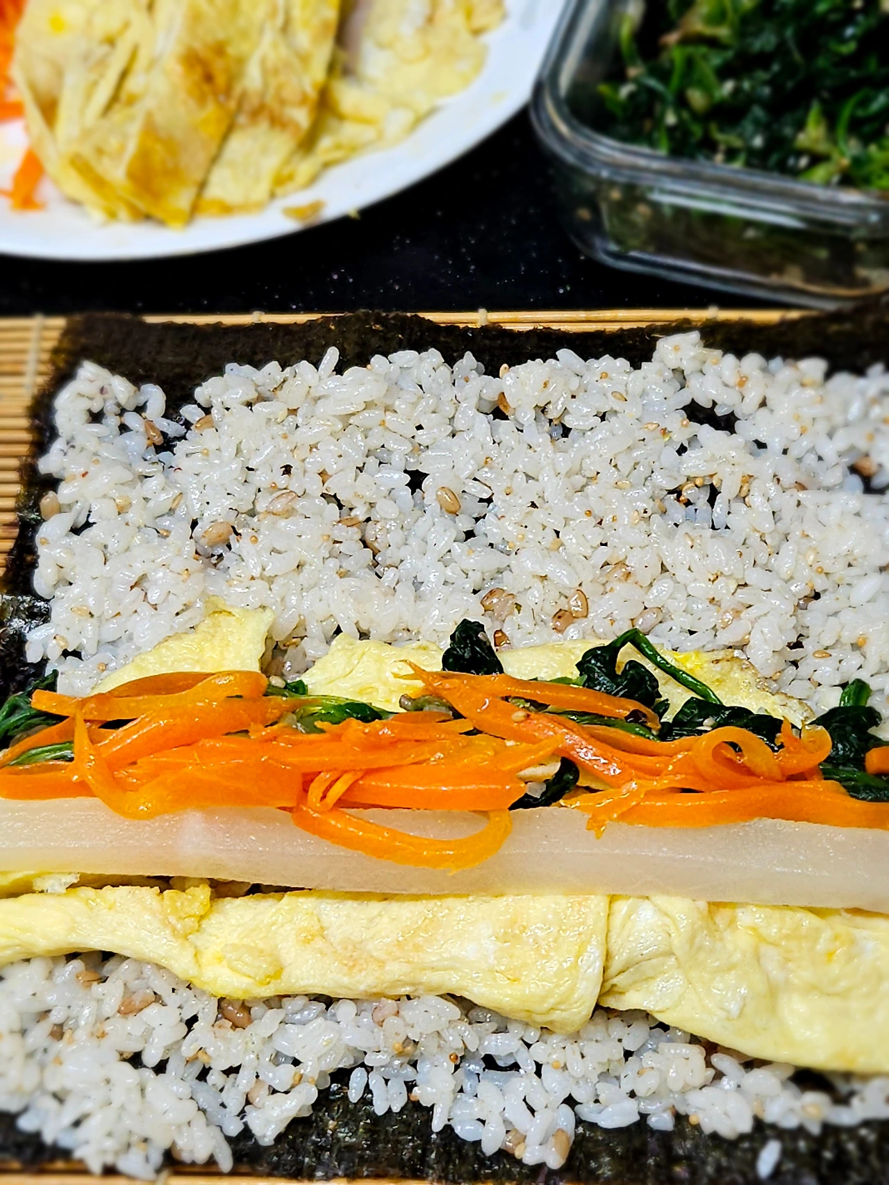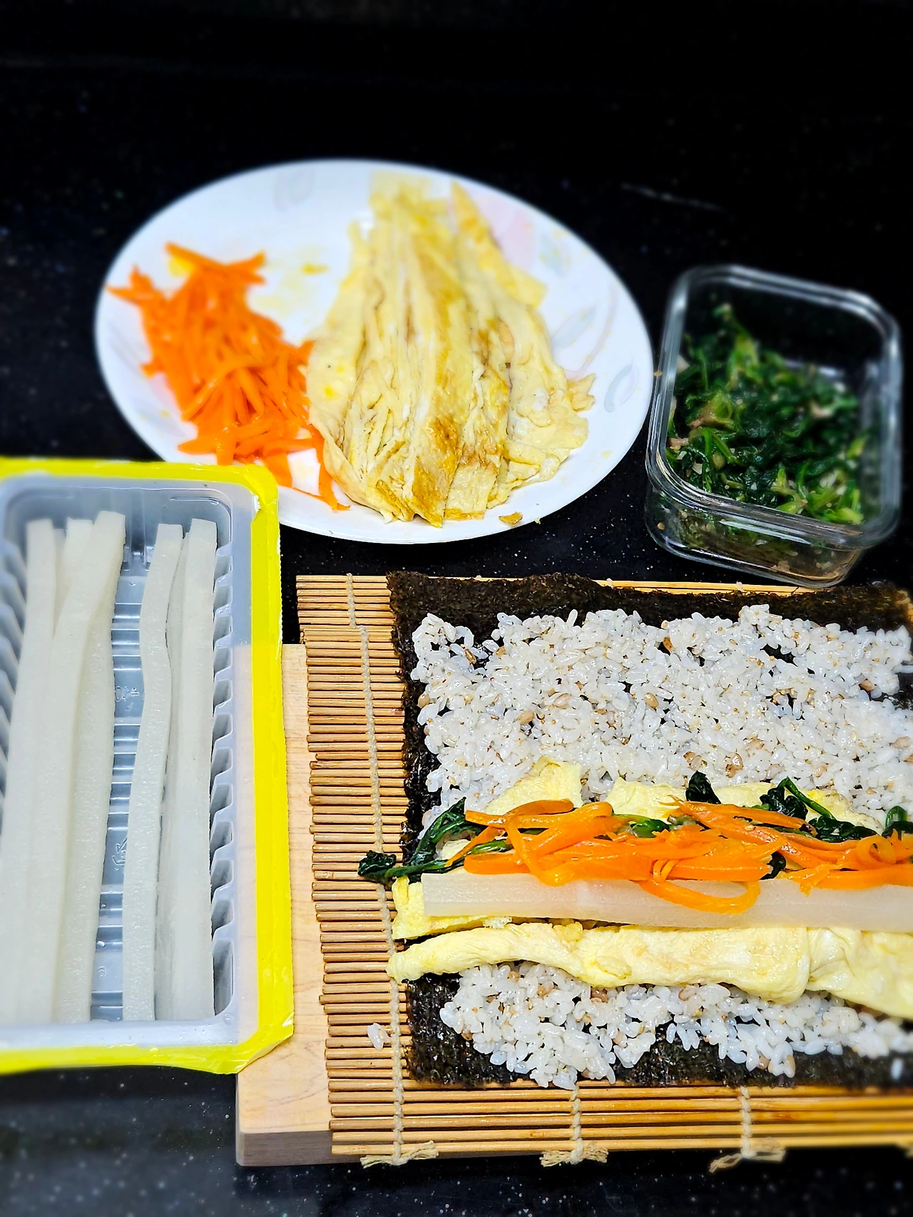 김발 위에 김을 펼치고 준비한 김밥용