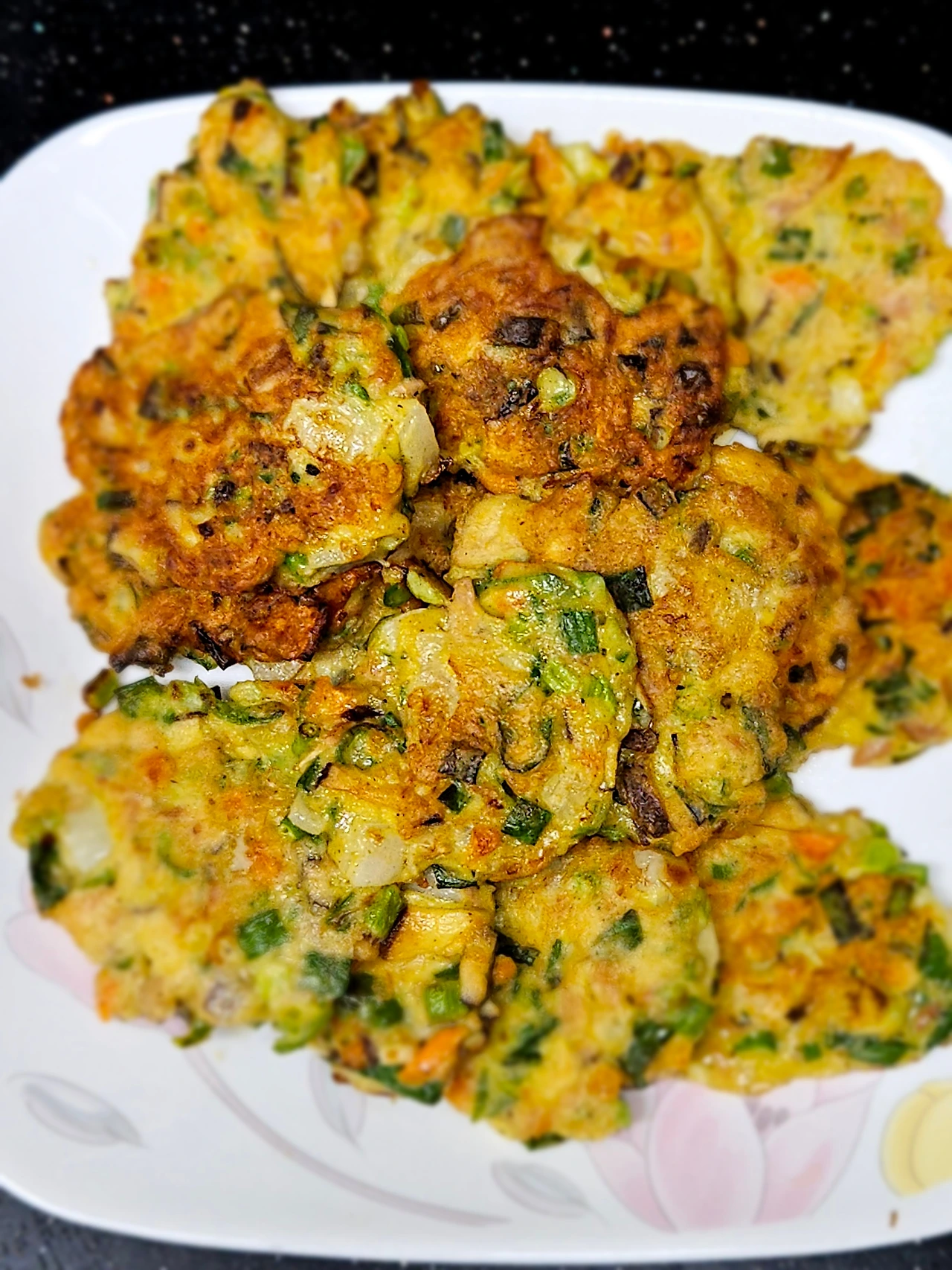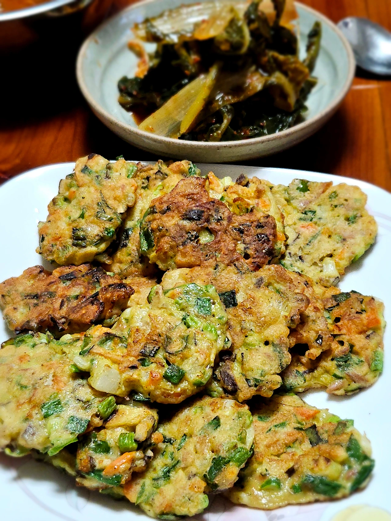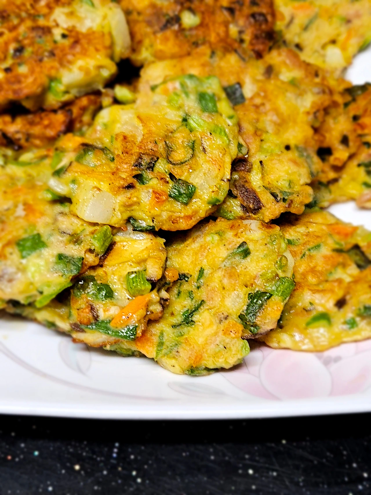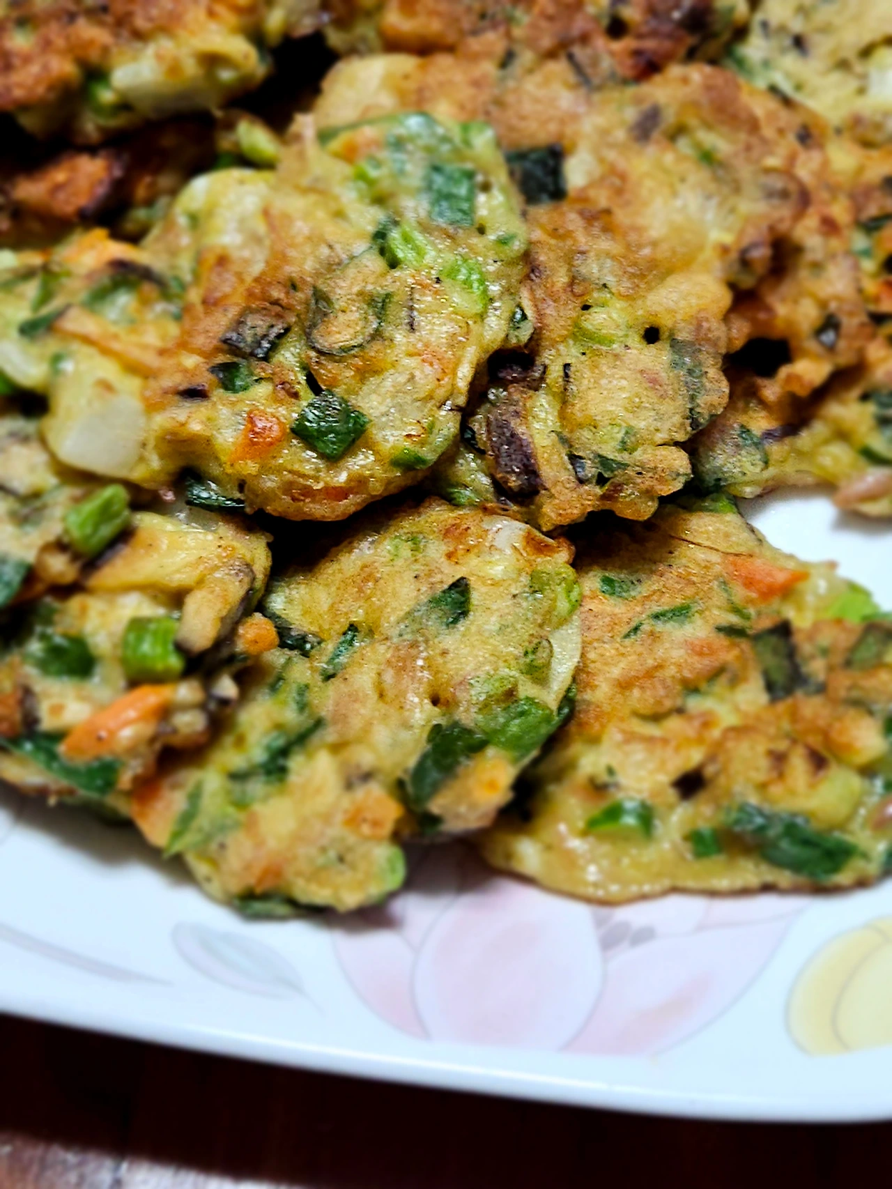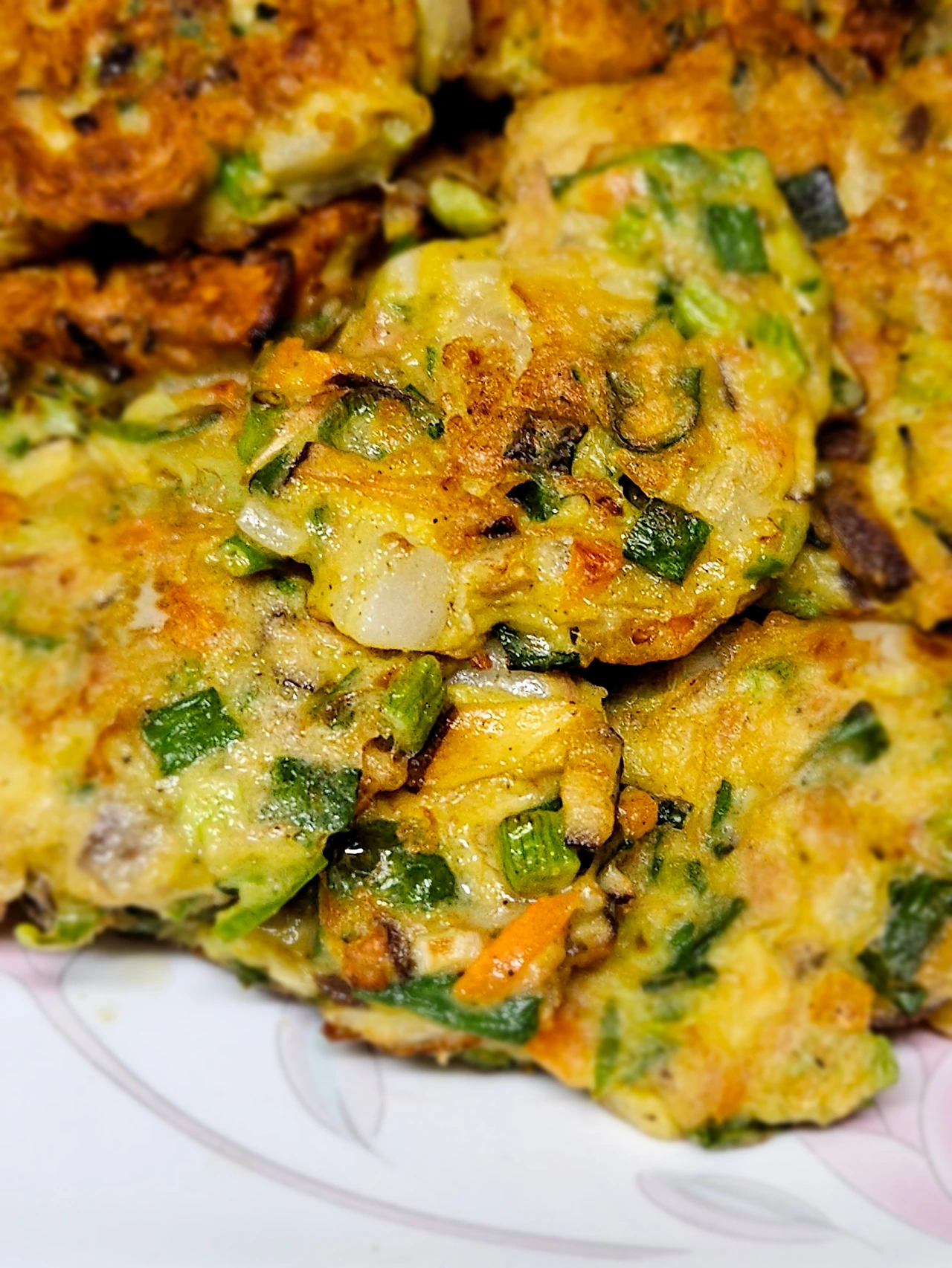 계란 5개 양푼에 잘 풀어줍니다 맛소금 1/2 티스푼 넣고 후춧가루 넣어주었어요 잘게 다져서 잘게 썰어서 준비한 야채들을 모두 계란물에 넣어줍니다 부침가루 1/2 컵 정도 넣고 잘 섞어줍니다 설탕 1 티스푼 넣고 참치캔 1개 뚜껑 열어서 참치 기름 살짝 빼고 양푼에 넣고 다른 재료들과 잘 섞어줍니다