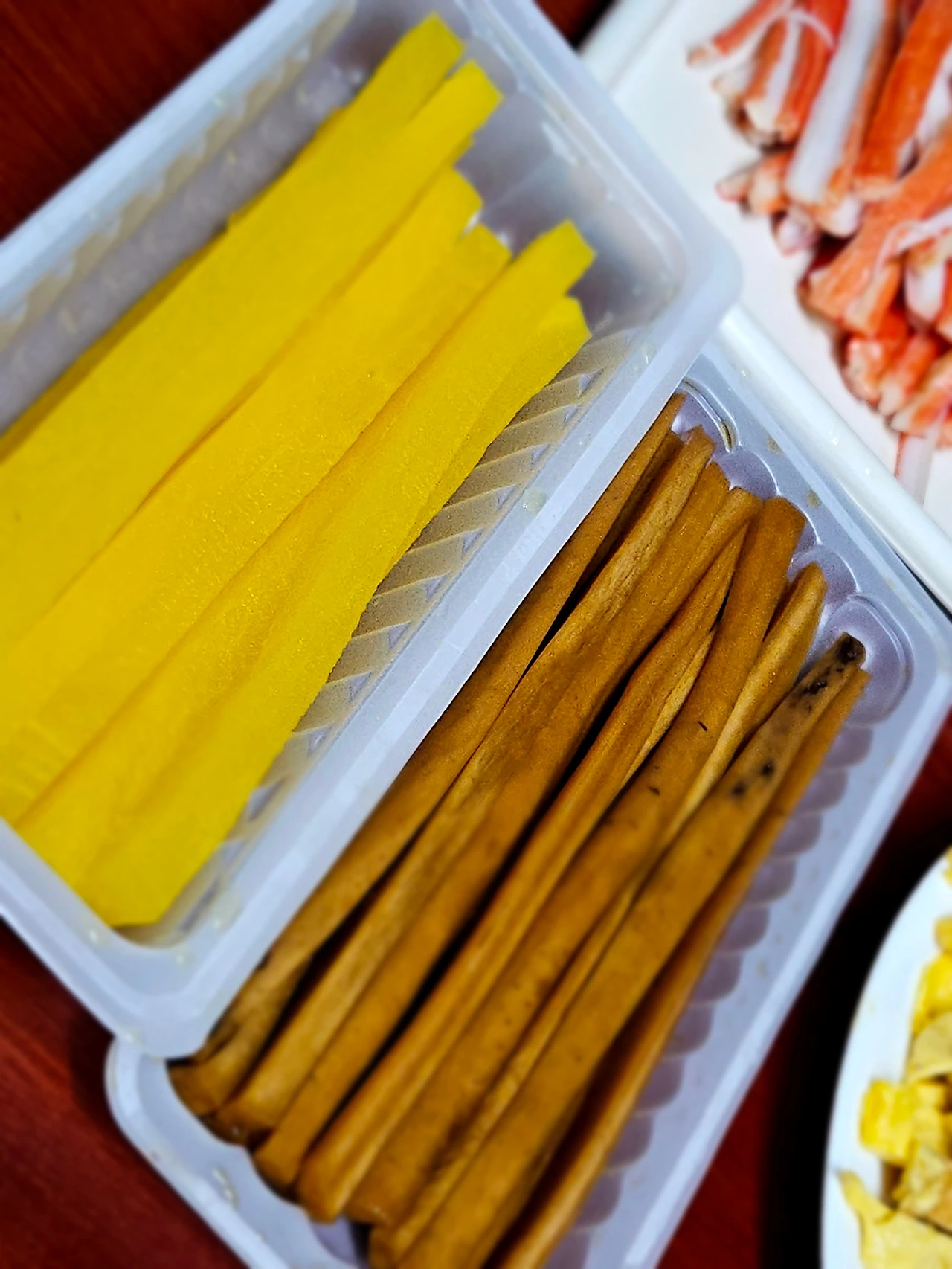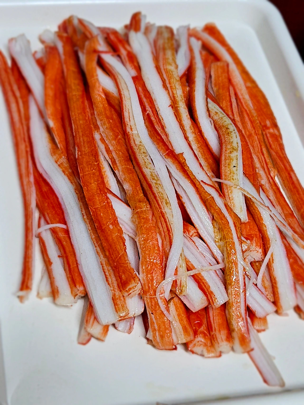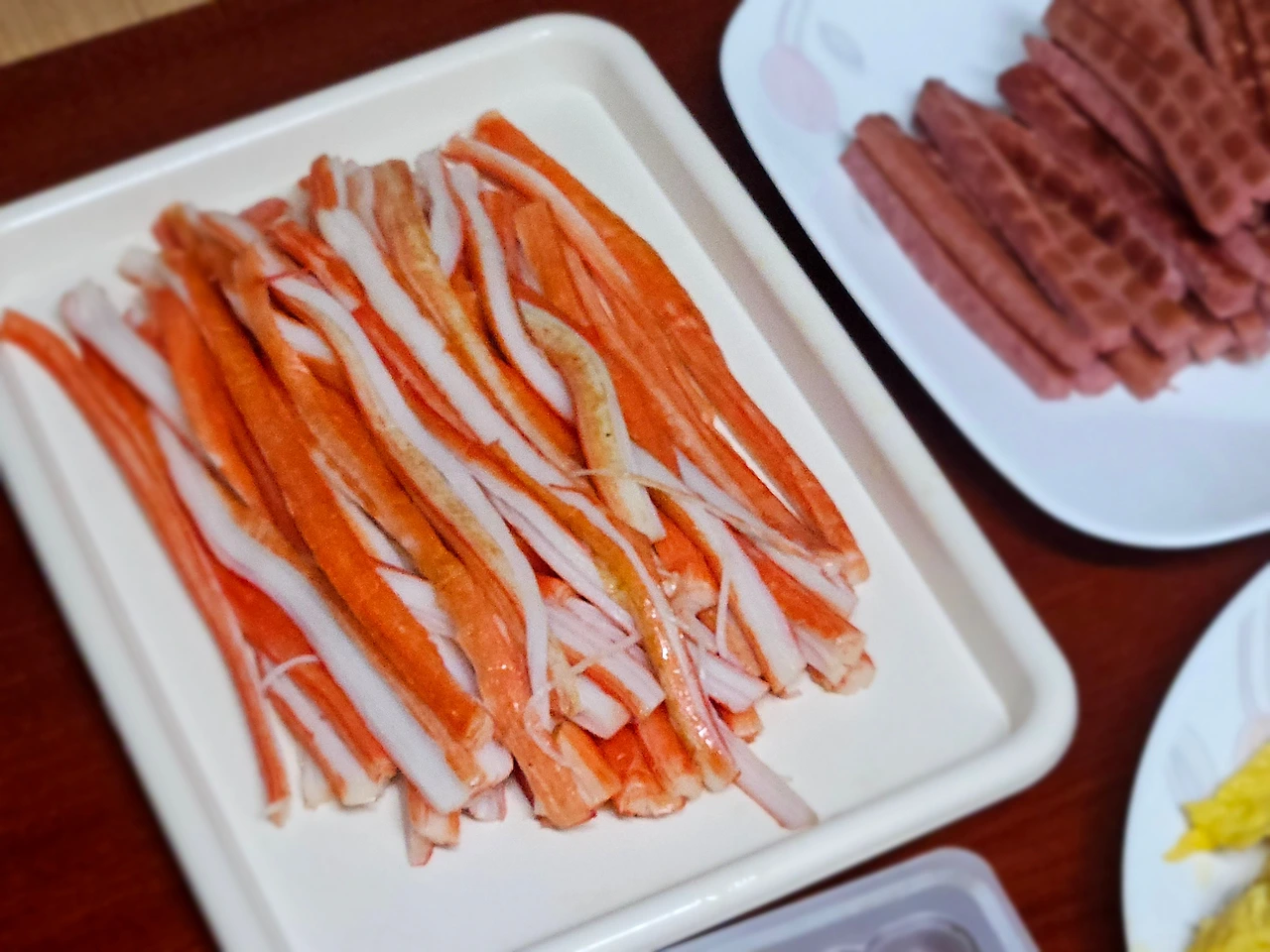 계란 지단 부치고 맛살도 하나씩 꺼내서 계란지단 부쳐 낸 후라이팬에 구웠어요 얇게 뜯어주었어요