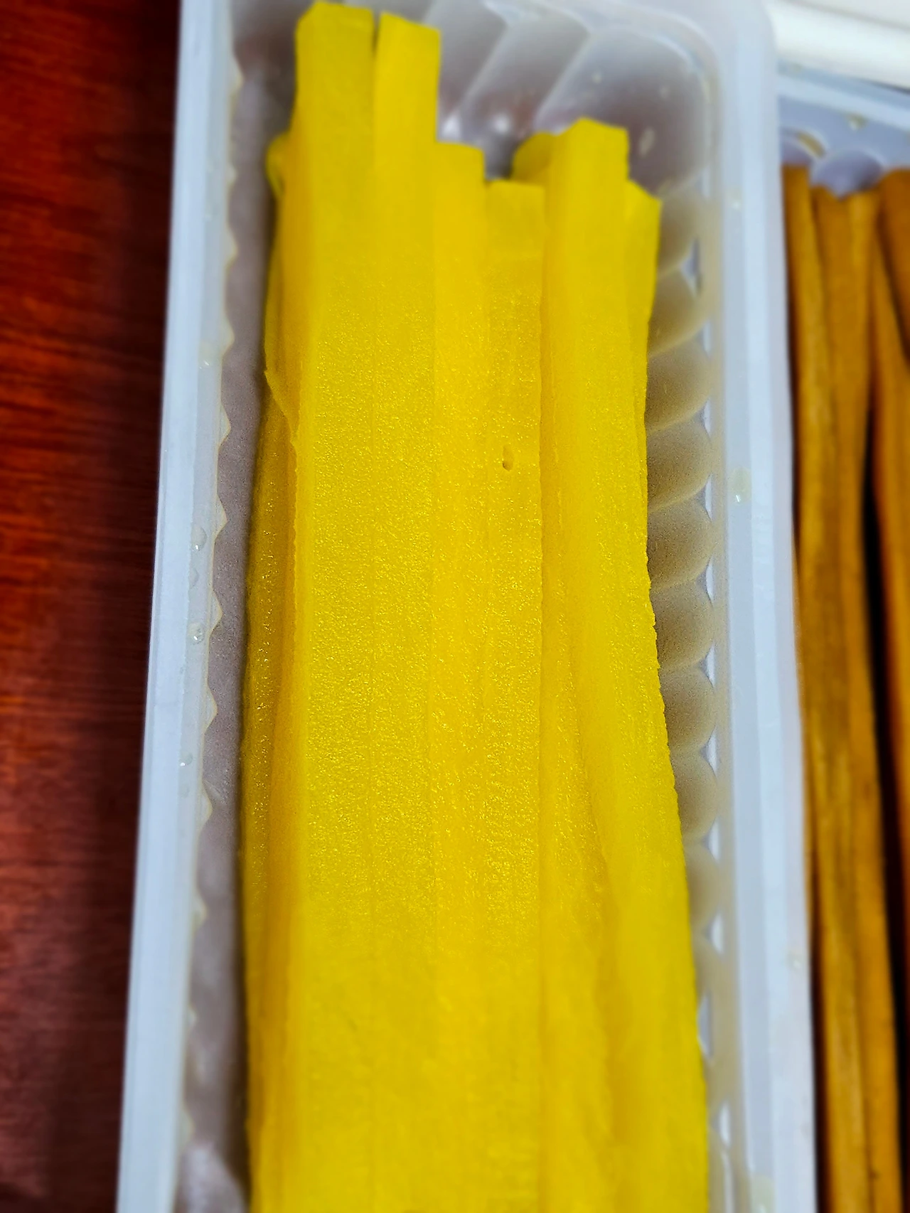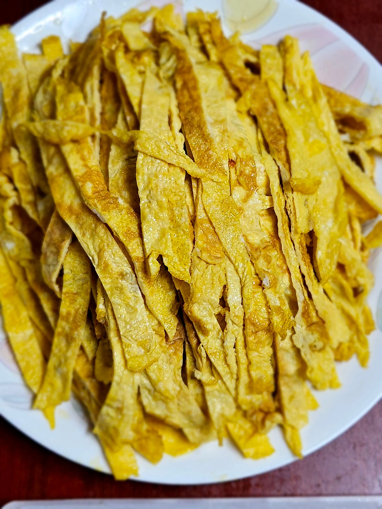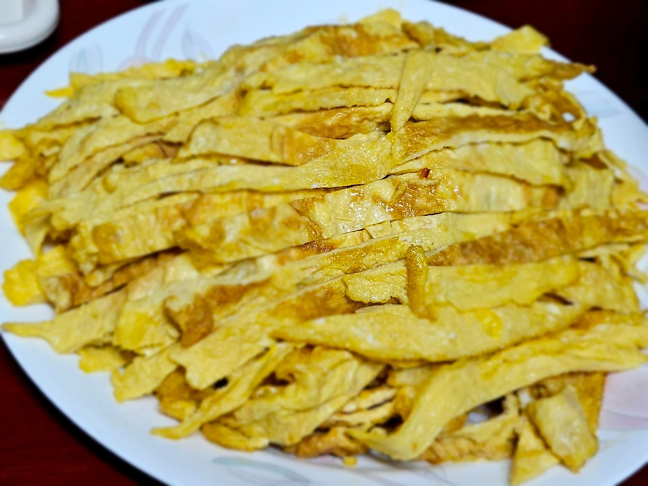 계란 지단 부치고 맛살도 하나씩 꺼내서 계란지단 부쳐 낸 후라이팬에 구웠어요 얇게 뜯어주었어요