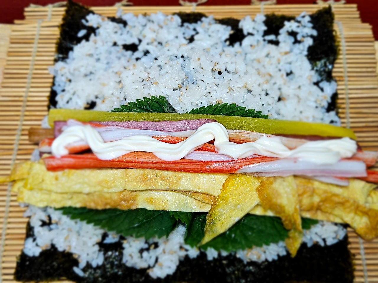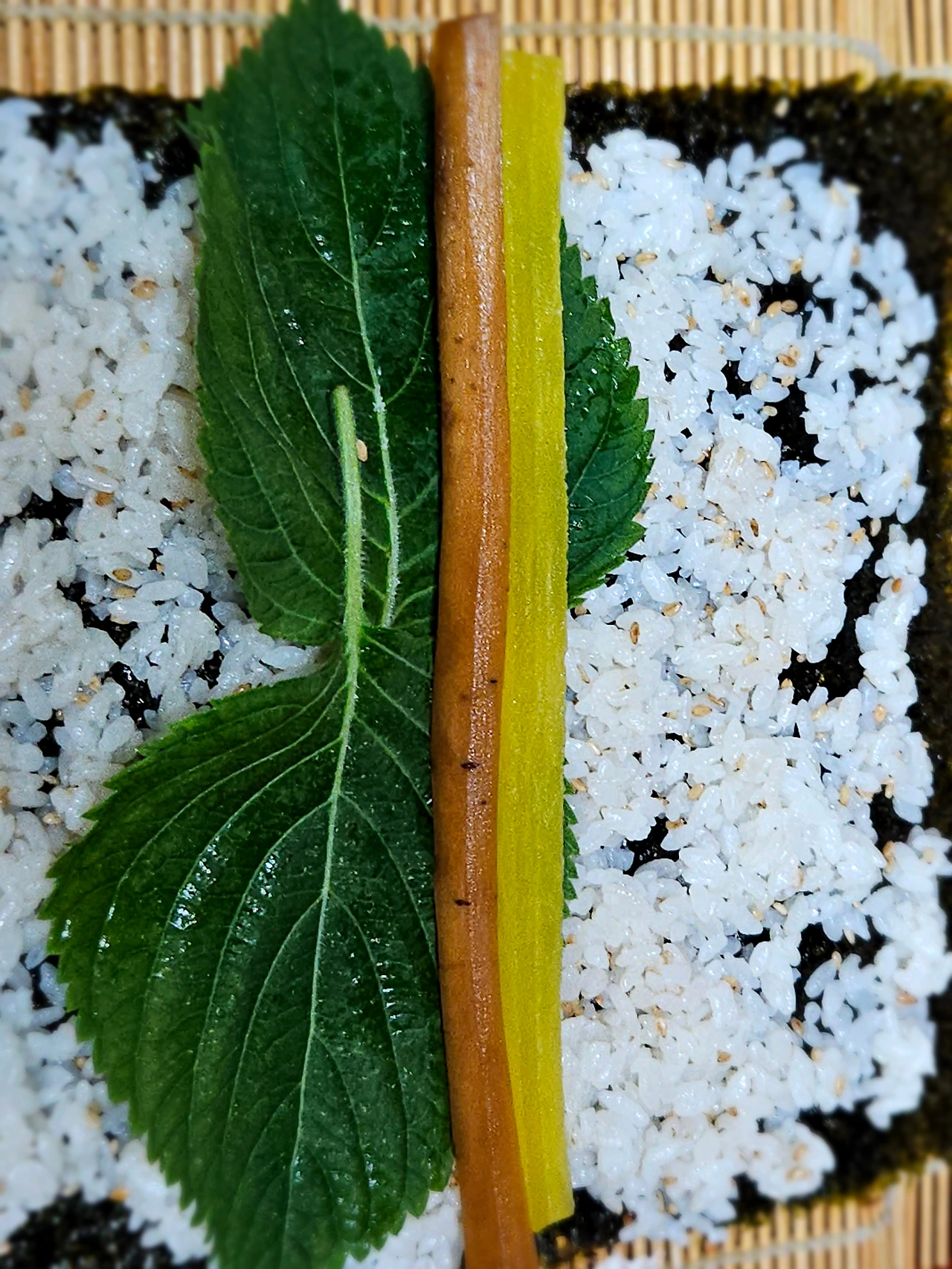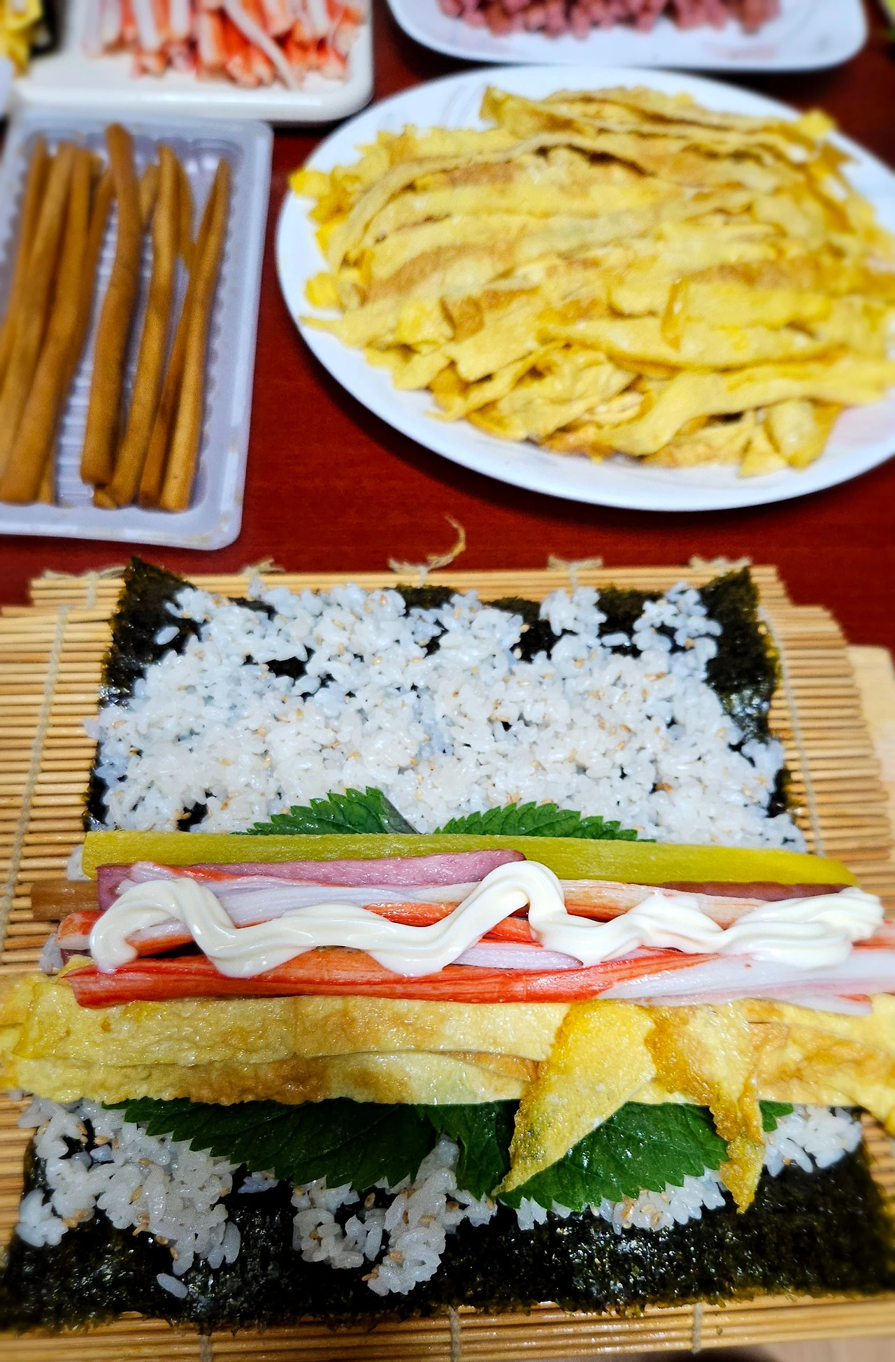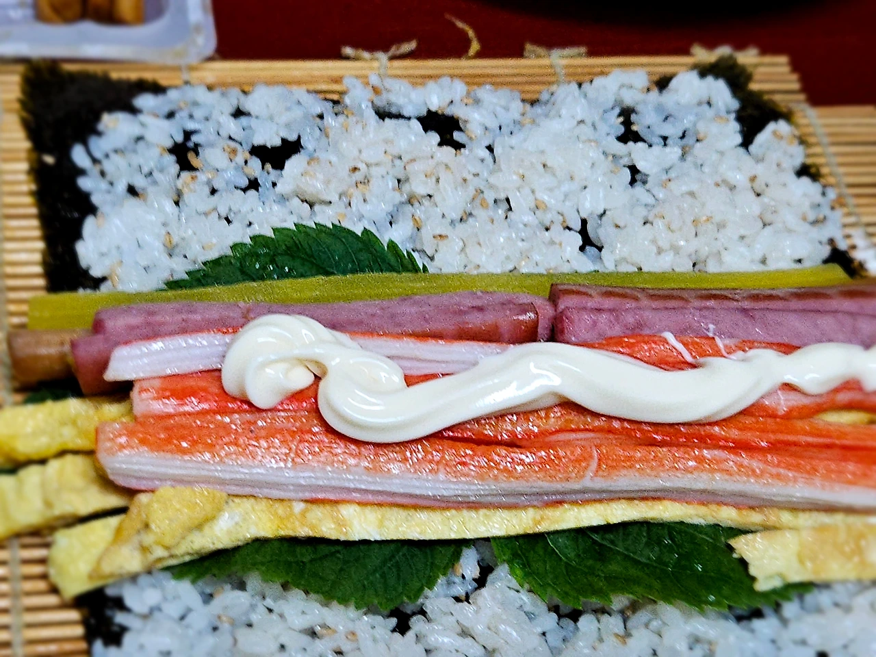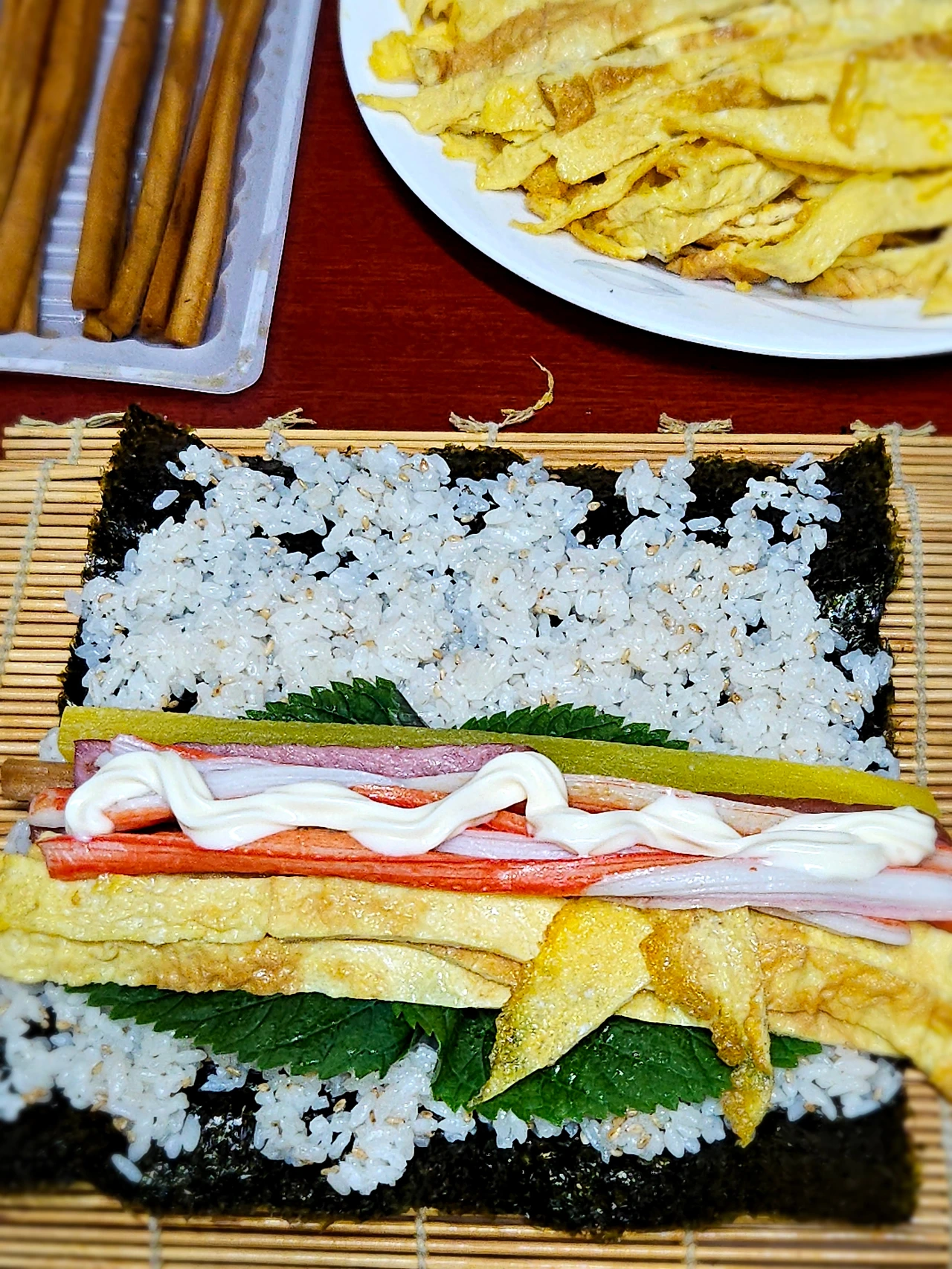 저희 집 아이들이 김밥에 마요네즈랑 참치도 넣어서 김밥 만들어달라고 했는데요 이때 집에 참치가 딱 떨어지고 1개도 없었거든요 그래서 아쉬운 마음에 깻잎이라도 깔고 김밥 재료 올리고 마요네즈 뿌려서 만들었어요