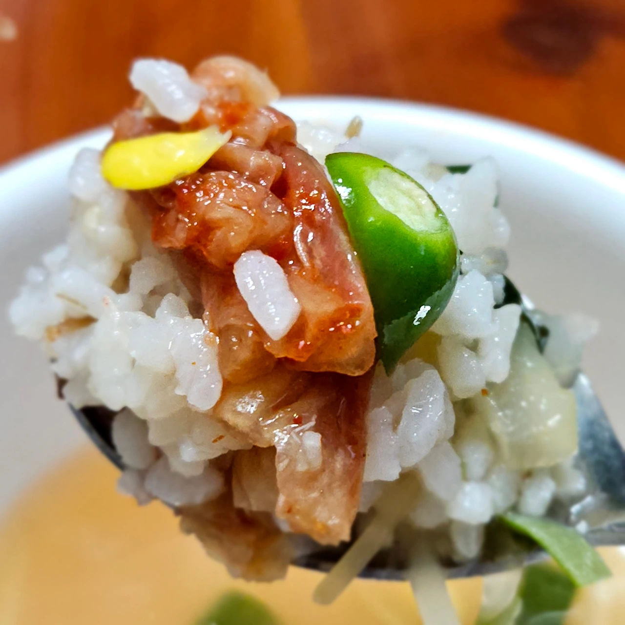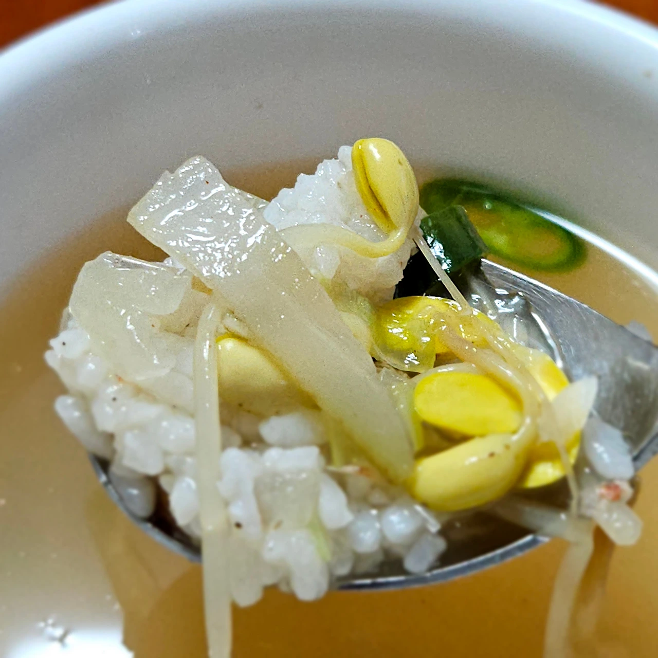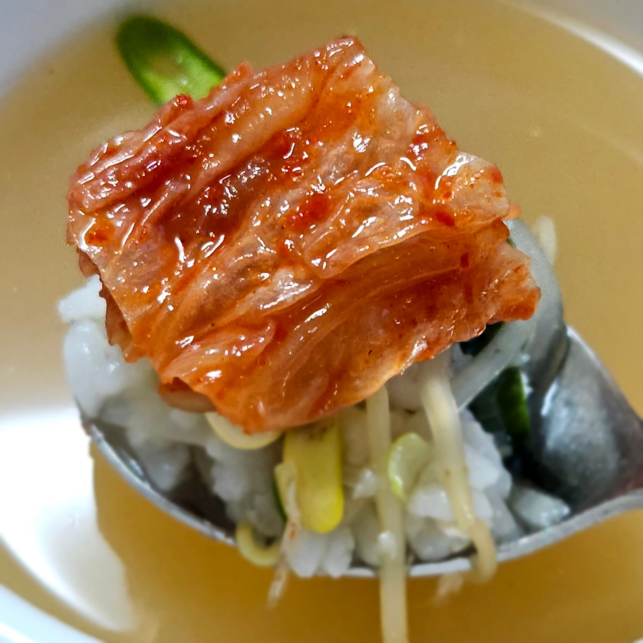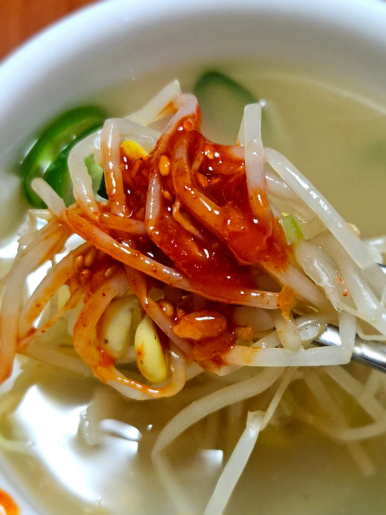 잘 먹는데 고춧가루 팍팍 넣고 만든 콩나물국 그런데 그걸 차갑게 식히고 냉장고에 더 차갑게 해서 김밥에