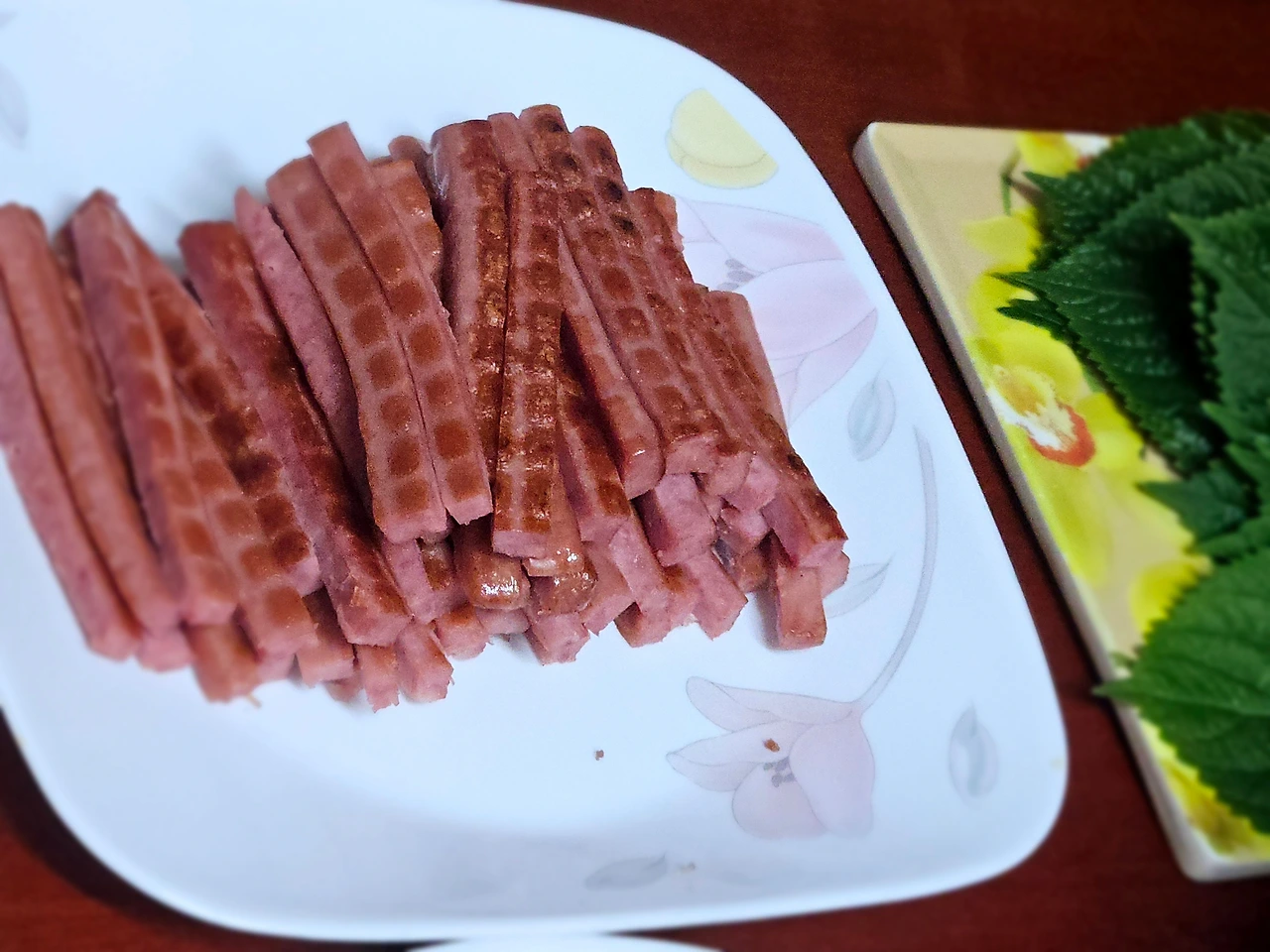 김밥용 햄도 뜨거운 물에 한번 데쳐 내고요 후라이팬에 구웠어요