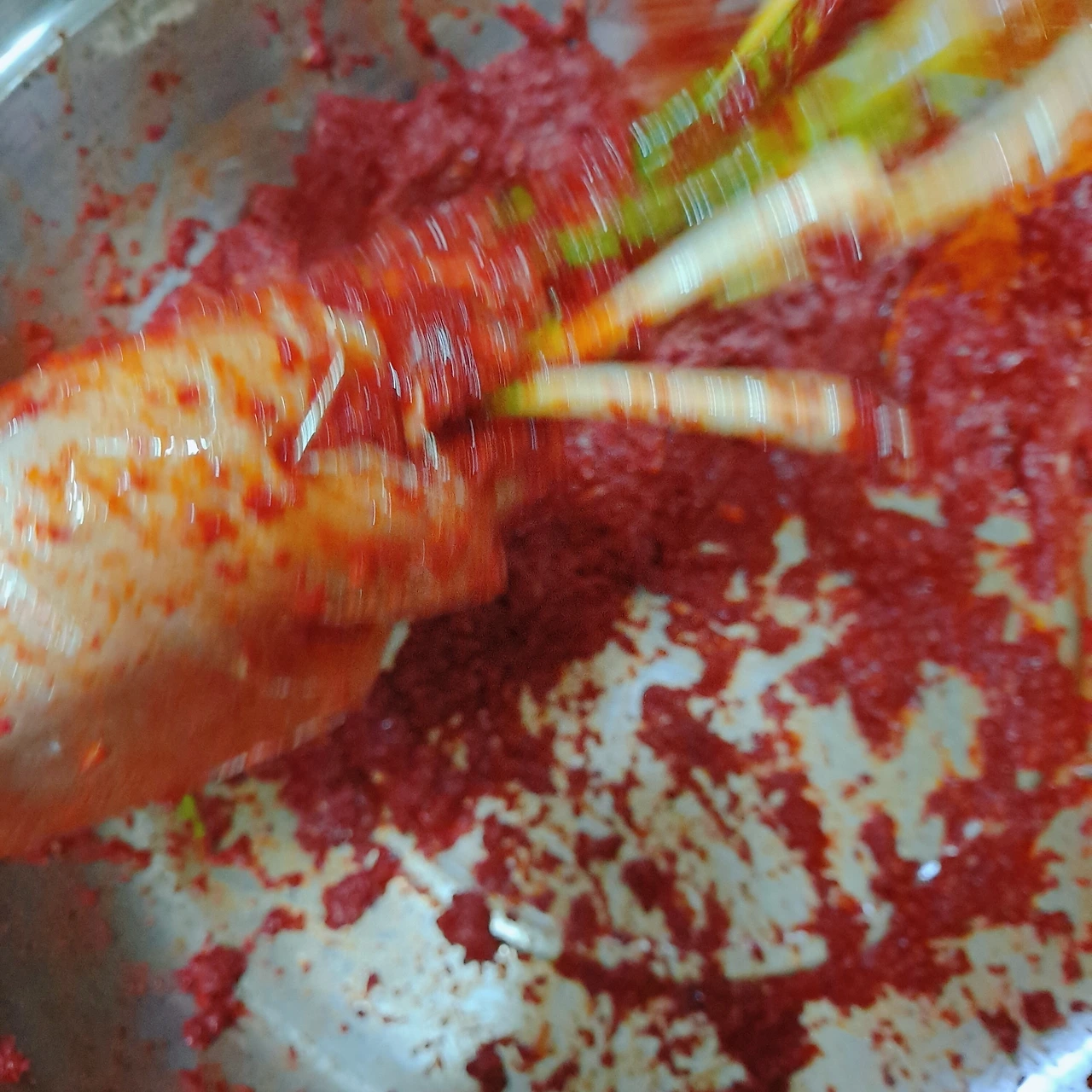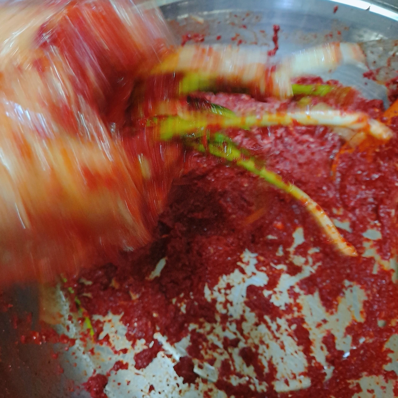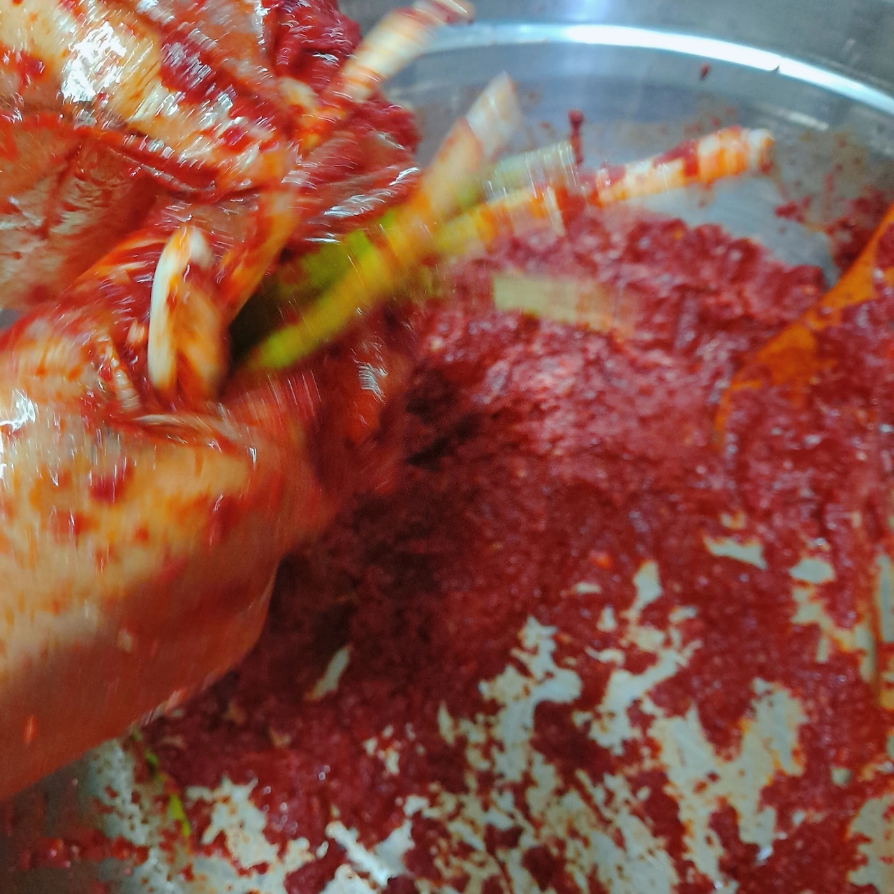 막내 아이가 김치 양념을 모두 저었어요 재밌어하더라고요