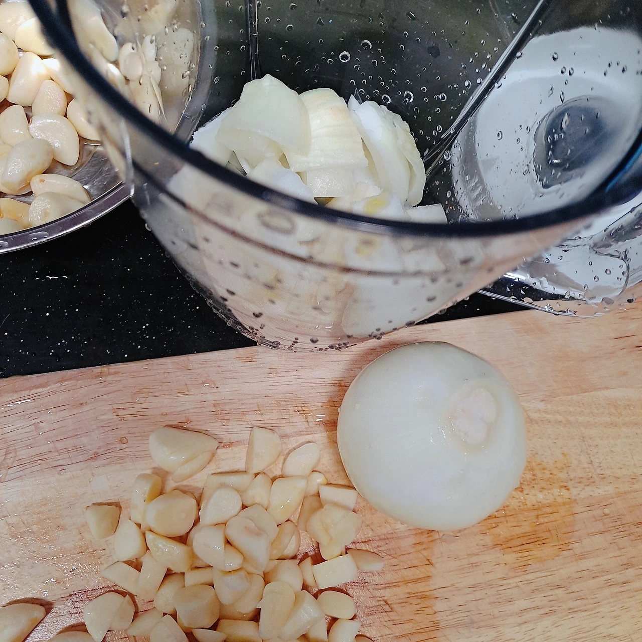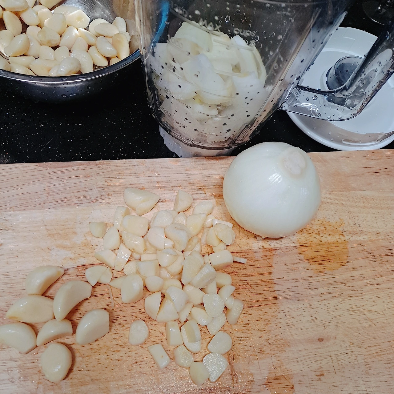 적당히 믹서기에 넣고 준비한 양파와 마늘을 함께 믹서기에 갈아줍니다