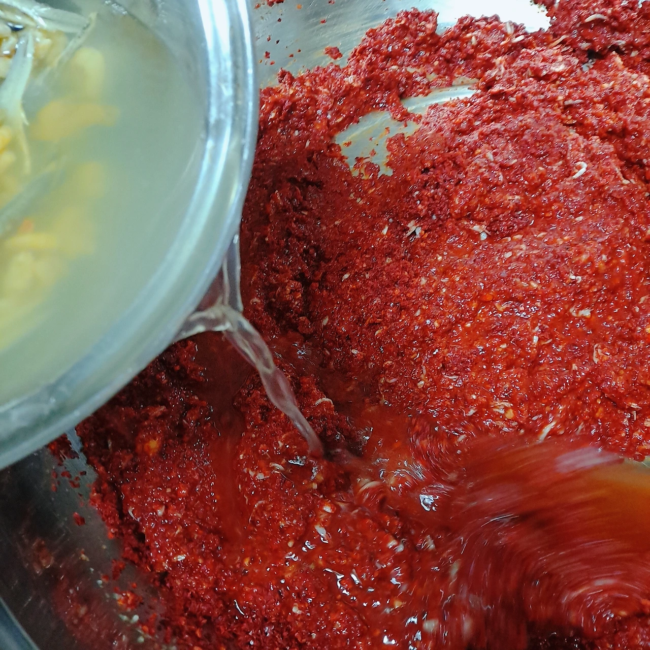 믹서기에 갈아낸 양파와 마늘을 준비한 양푼에 부어줍니다 고춧가루는 옆에서 지켜보던
