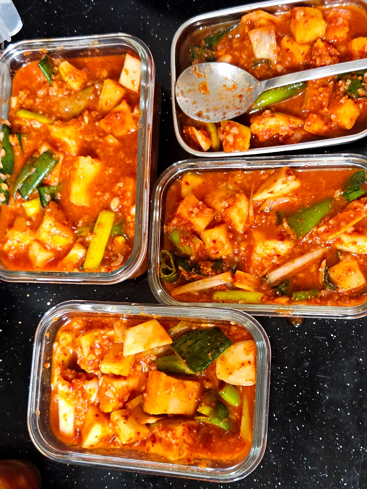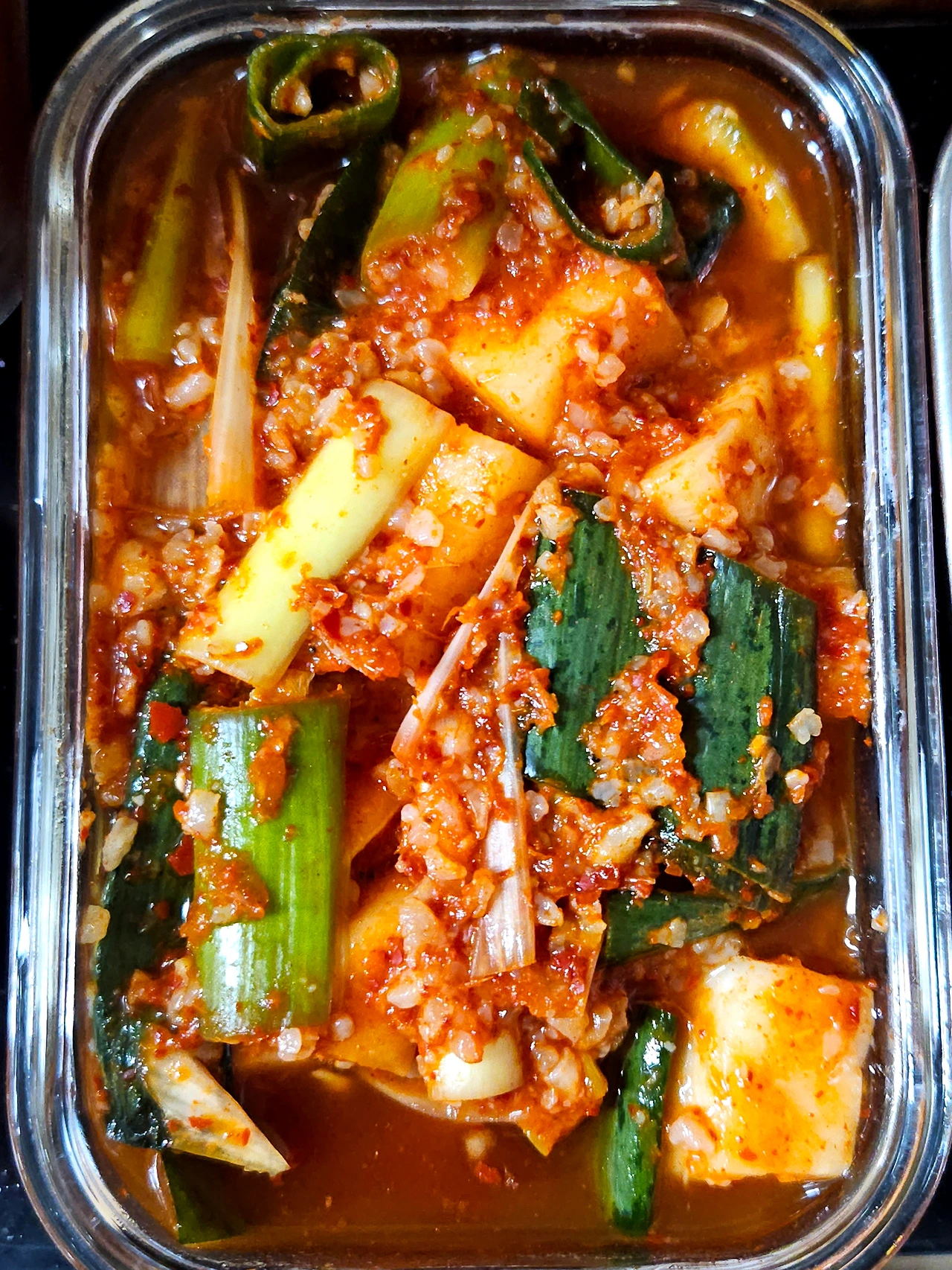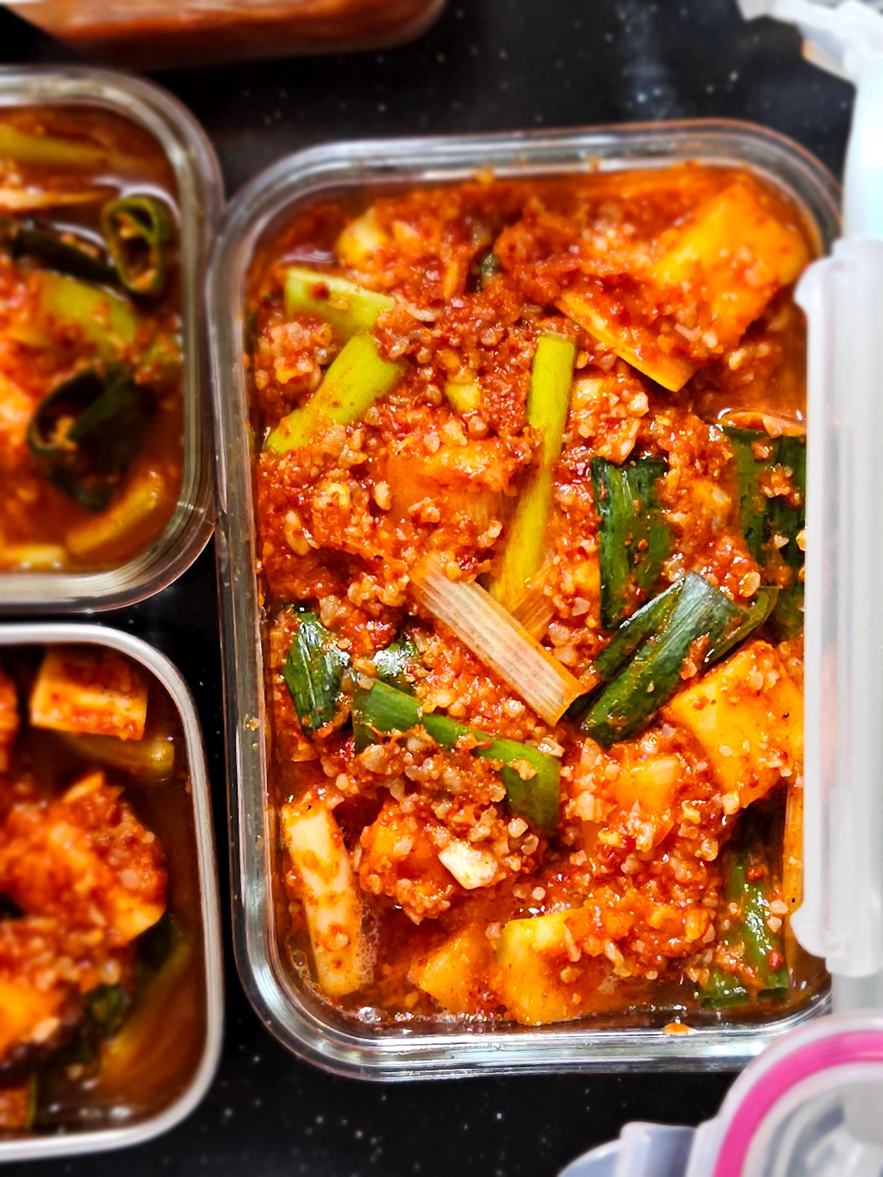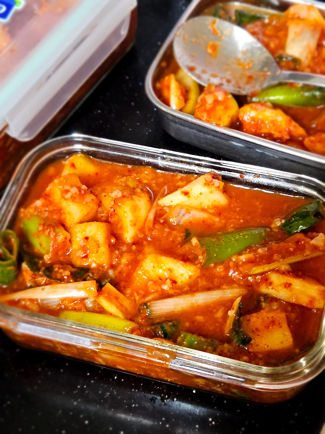 마땅히 커다란 김치 통이 딱 없어서 작은 밀폐용기를 꺼내서 깍두기며 배추 겉절이며 덜어서 담아 놓았거든요 김치 뚜껑을 열어보니 하루 사이에 금세 김칫 국물이 자박자박하게 생겼어요