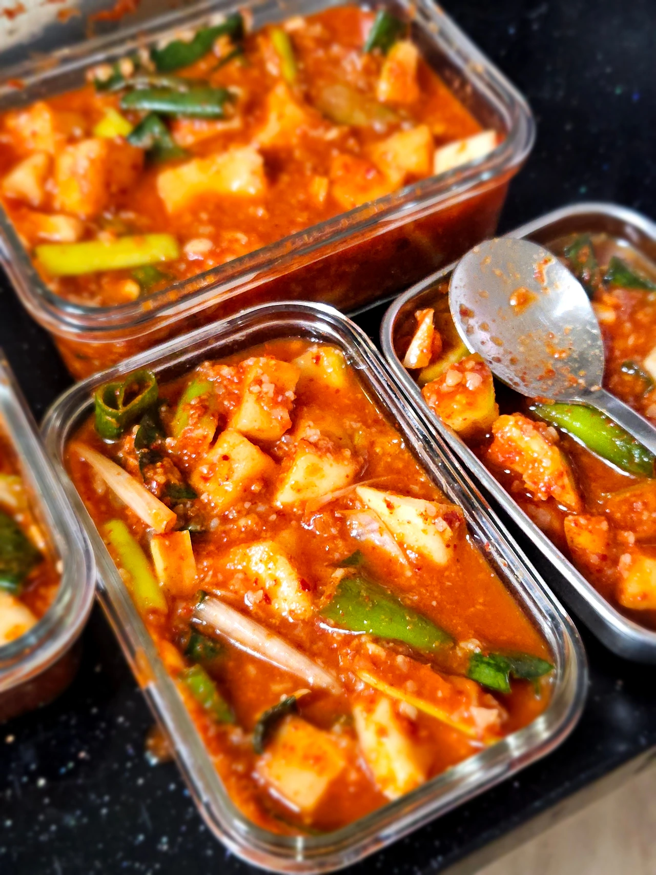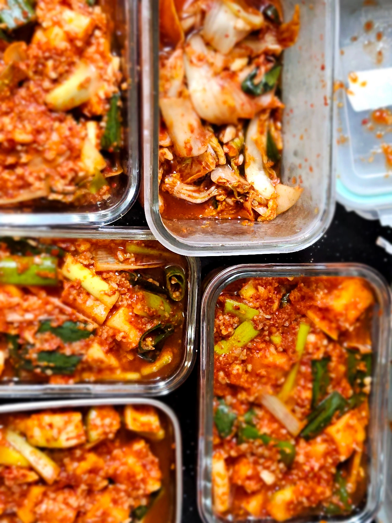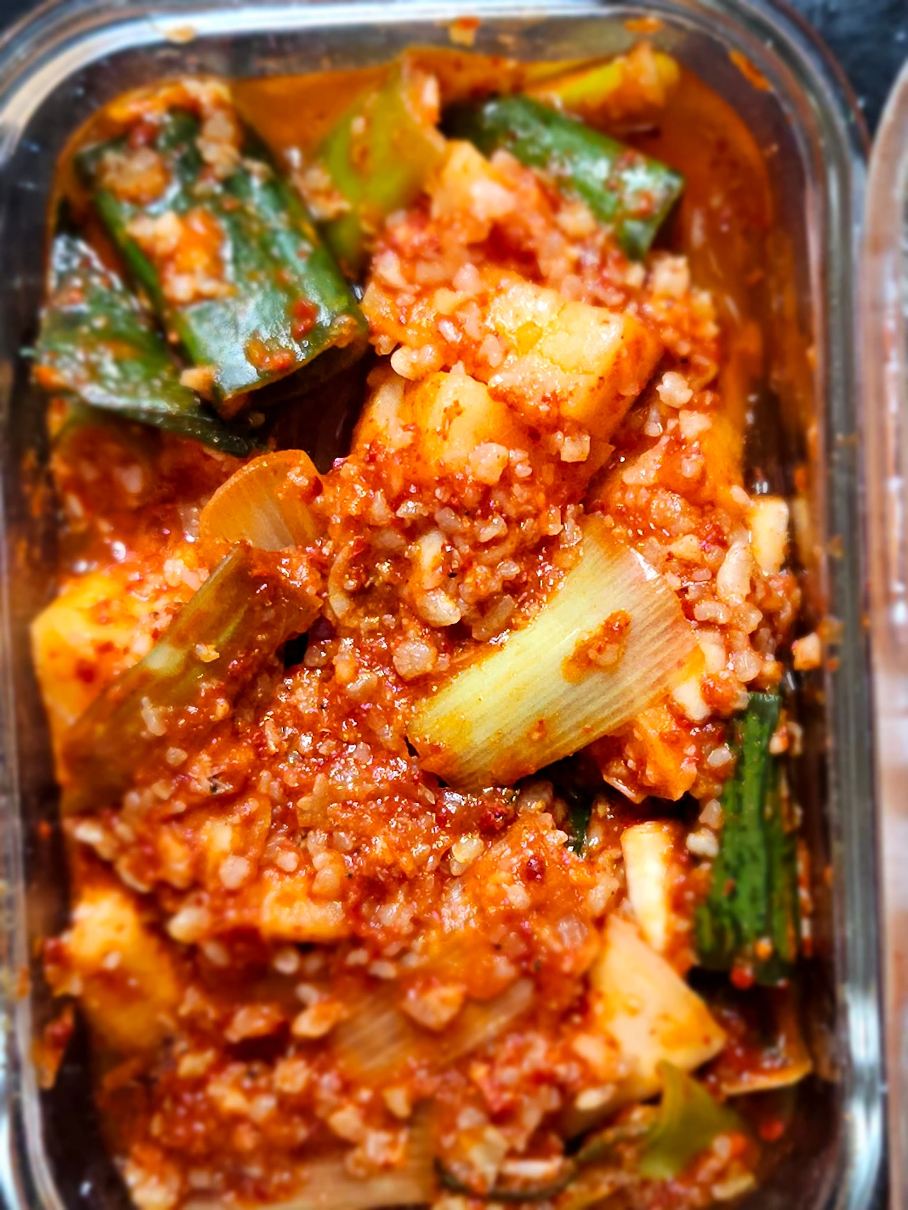 마땅히 커다란 김치 통이 딱 없어서 작은 밀폐용기를 꺼내서 깍두기며 배추 겉절이며 덜어서 담아 놓았거든요 김치 뚜껑을 열어보니 하루 사이에 금세 김칫 국물이 자박자박하게 생겼어요